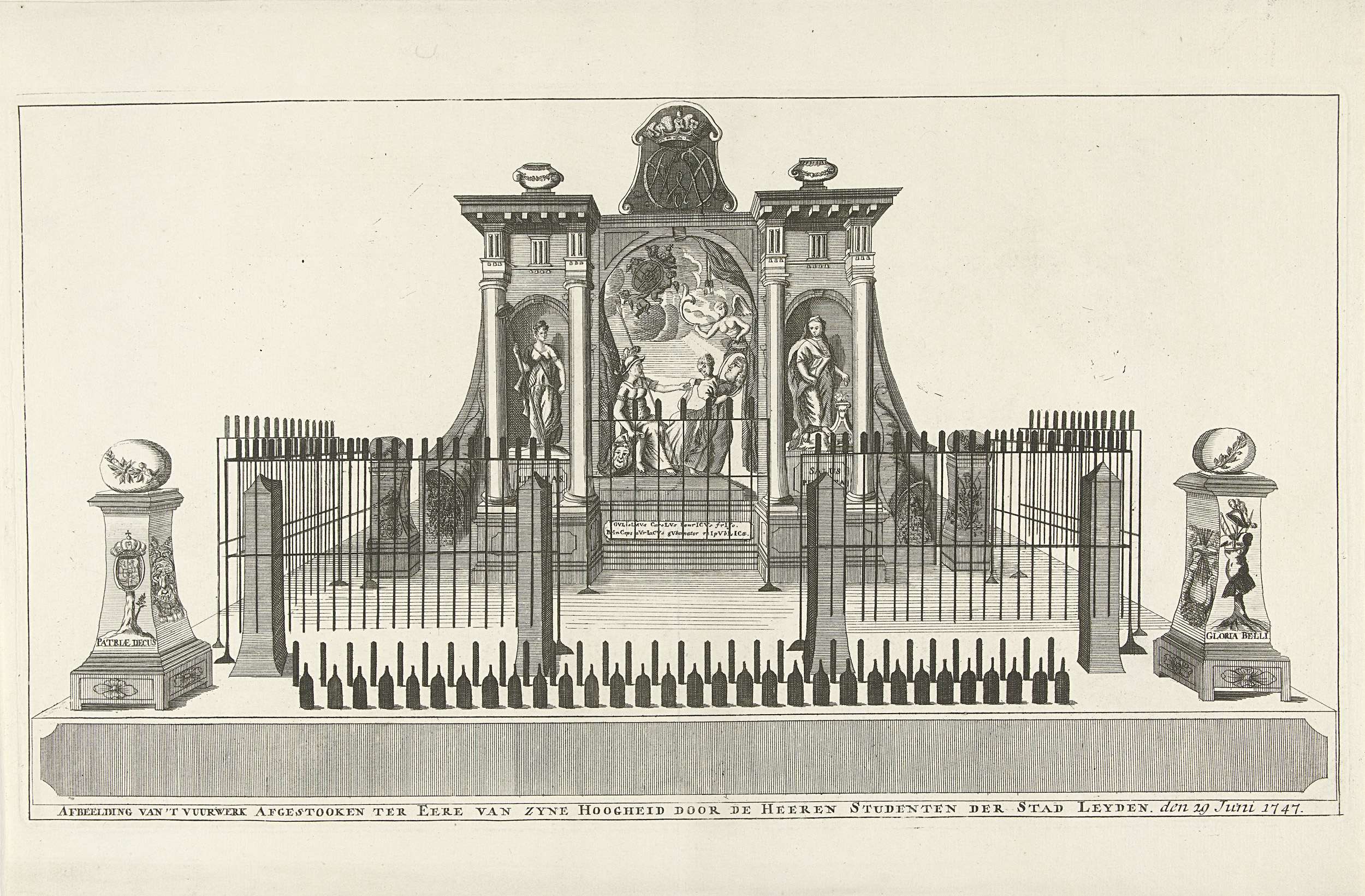 Stellage voor het vuurwerk afgestoken in opdracht van de studenten van de Universiteit van Leiden ter ere van de aanstelling van prins Willem IV tot stadhouder van de Republiek op 29 juni 1747.