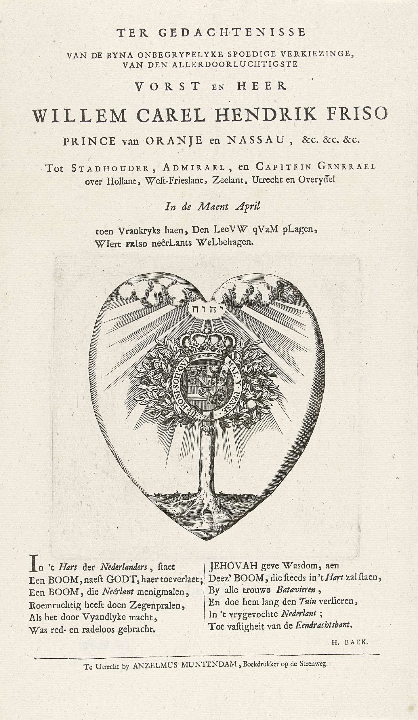Hartvormig embleem met het gekroonde wapen van stadhouder Willem IV in de Oranjeboom met Orde van de Kousenband, april 1747. Op het blad onder de plaat een vers in twee kolommen.
