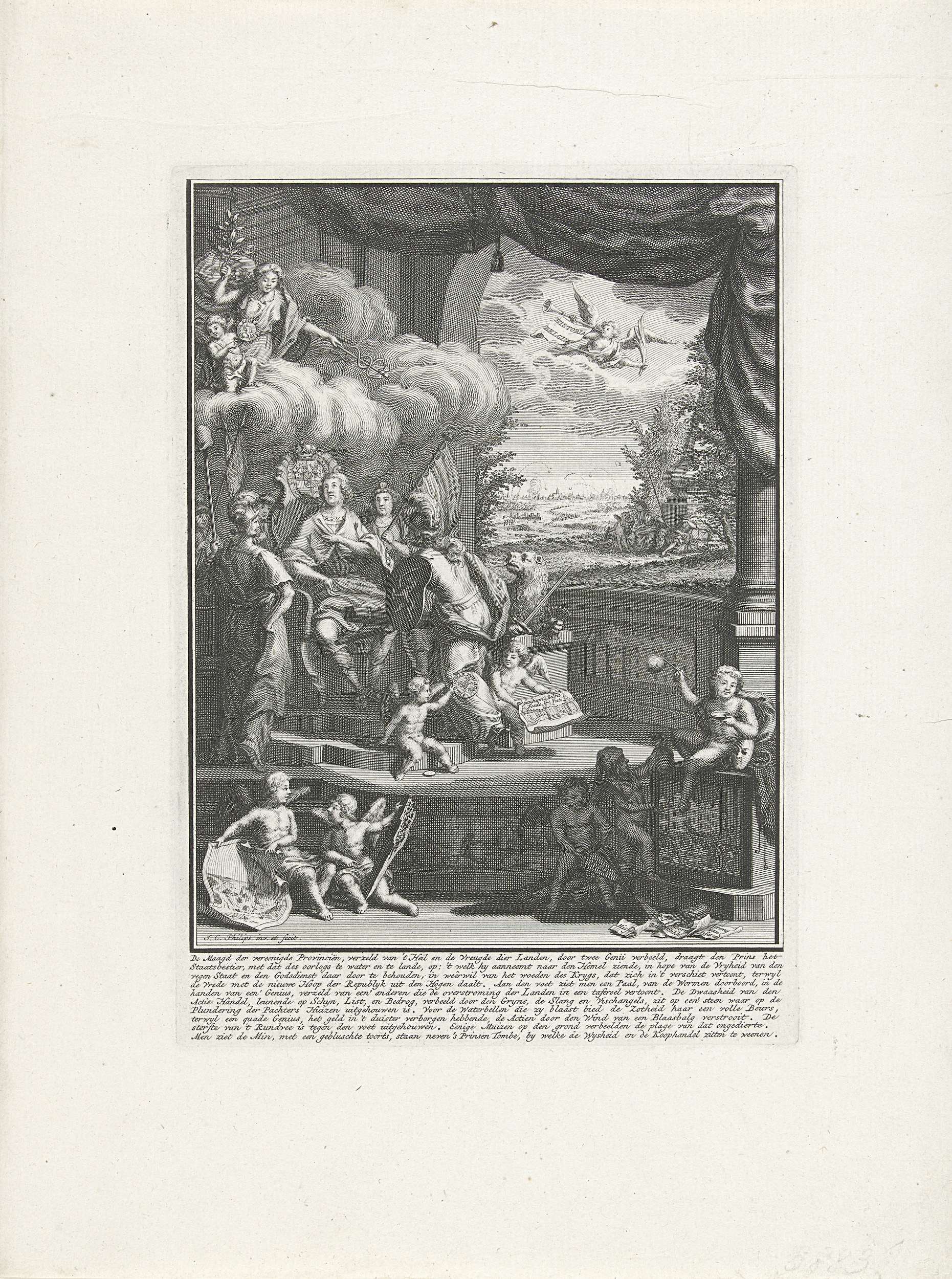 Allegorie op de installatie van Willem IV als stadhouder in 1747. Stadhouder Wilem IV zittend op troon ontvangt van de Nederlandse Maagd het staatsbestuur. In de wolken de Vrede en blaast de Faam op een bazuin met de vaandel Historia Belgii, op de voorgrond rechts engeltjes die verwijzen naar de Windhandel van 1720. Op de ...