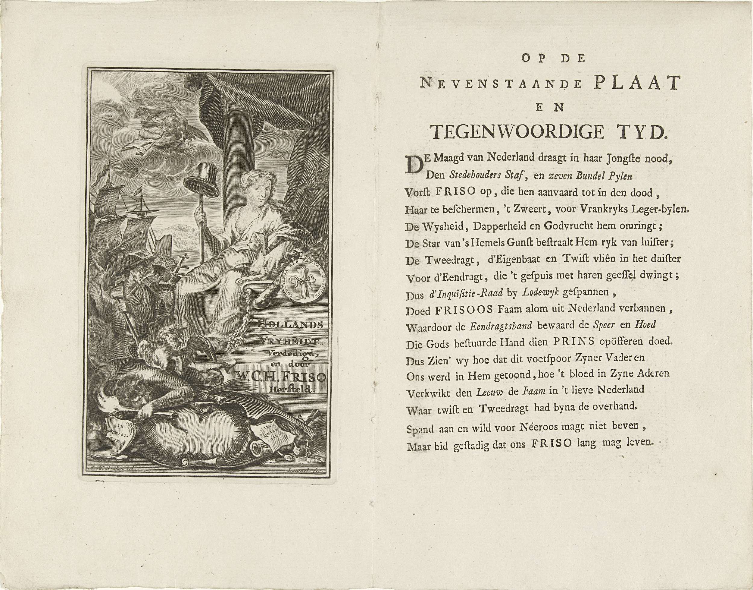 Allegorie op de installatie van Willem IV als stadhouder in 1747. De Nederlandse Maagd gezeten op een troon met lans en vrijheidshoed. Op de voorgrond symbolen van Tweedracht en de Franse Inquisitie. Op de achtergrond zeelieden en schepen. Op het blad naast de plaat staat een verklaring van de voorstelling in versvorm.