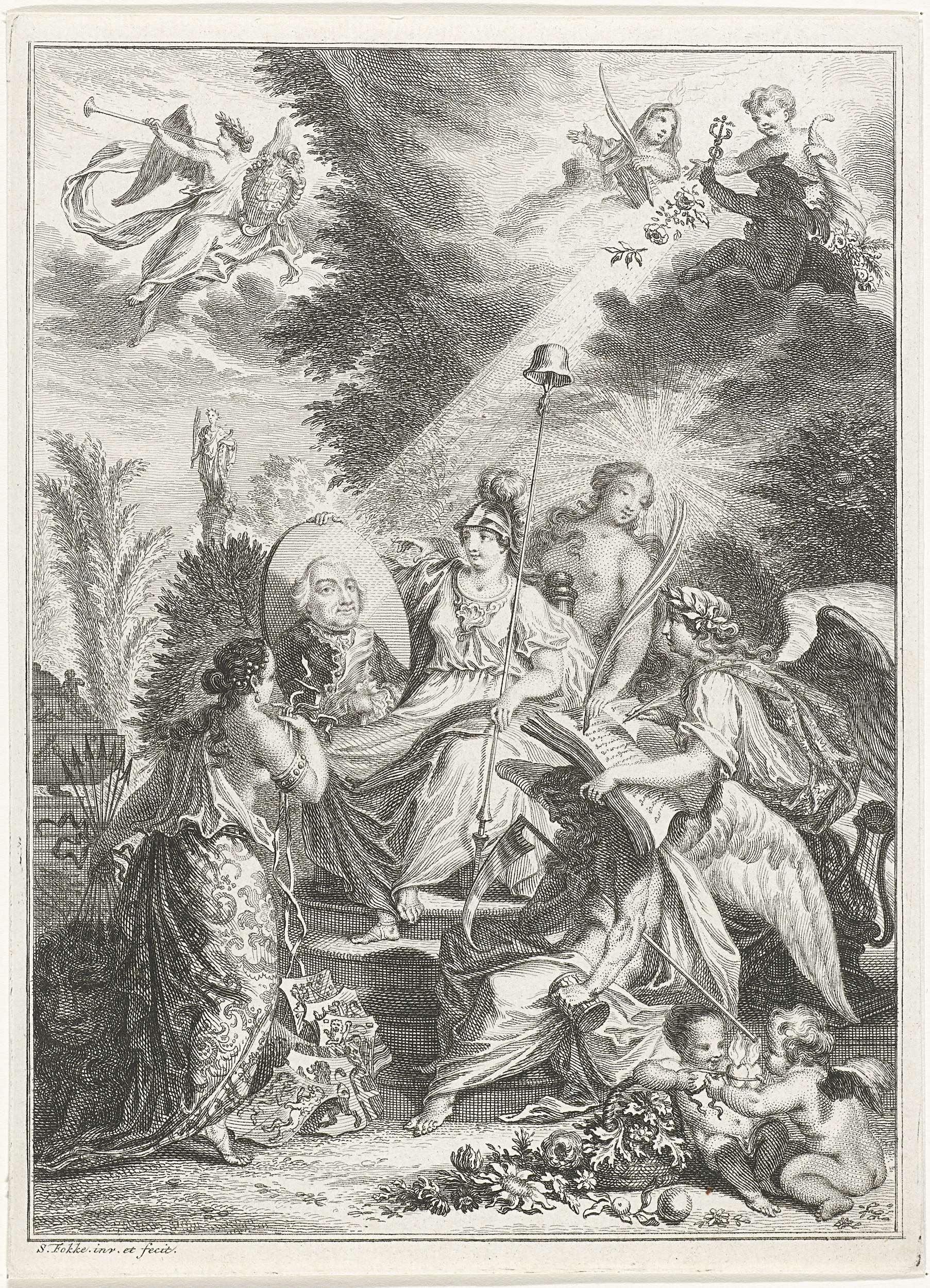 Allegorie ter ere Willem IV, 1755. Minerva met lans en vrijheidshoed en een portret van de stadhouder, op de voorgrond de Nederlandse Maagd. De Waarheid helpt de Geschiedenis met het schrijven in een boek dat rust op de schouders van de Tijd. In de wolken de Faam en engeltjes.