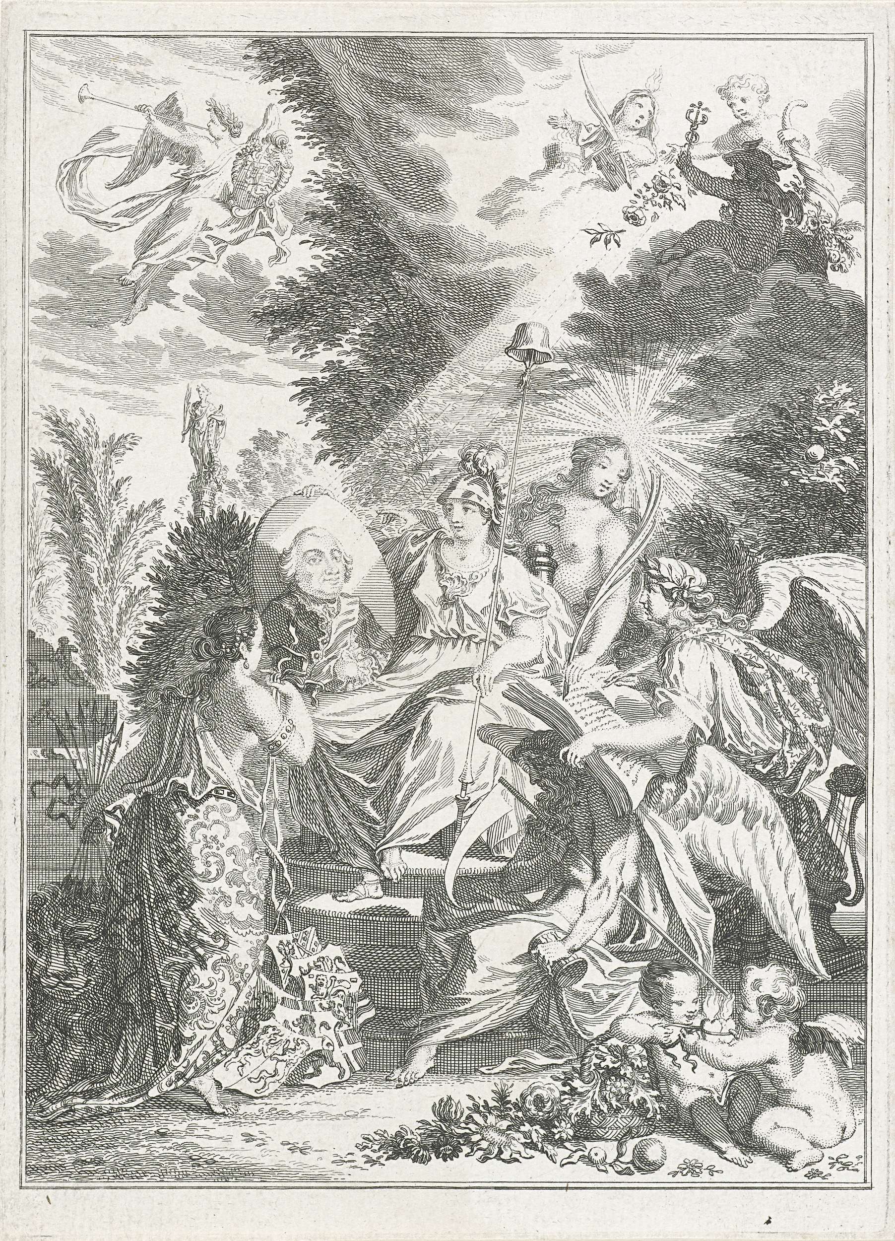 Allegorie ter ere Willem IV, 1755. Minerva met lans en vrijheidshoed en een portret van de stadhouder, op de voorgrond de Nederlandse Maagd. De Waarheid helpt de Geschiedenis met het schrijven in een boek dat rust op de schouders van de Tijd. In de wolken de Faam en engeltjes.