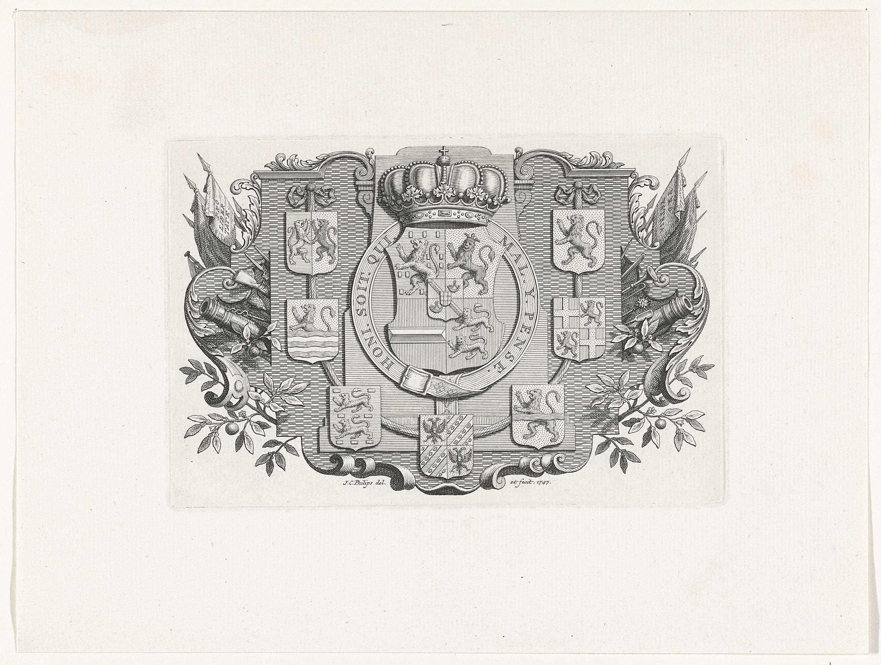 Het wapen van stadhouder Willem IV met Orde van de Kousenband en omringd door de wapens van de zeven provincies, vaandels en kanonnen, 1747.