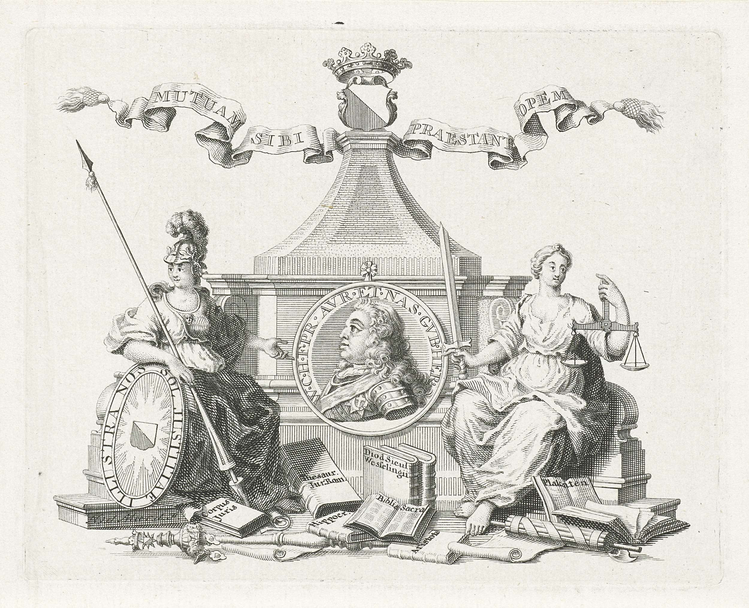 Monument met een portretmedaillon van stadhouder Willem IV tussen Minerva en de Rechtvaardigheid. Op het monument en op het schild van Minerva staat het wapen van Utrecht. Op de grond boeken, geschriften en de universiteitsstaf van de Universiteit van Utrecht.