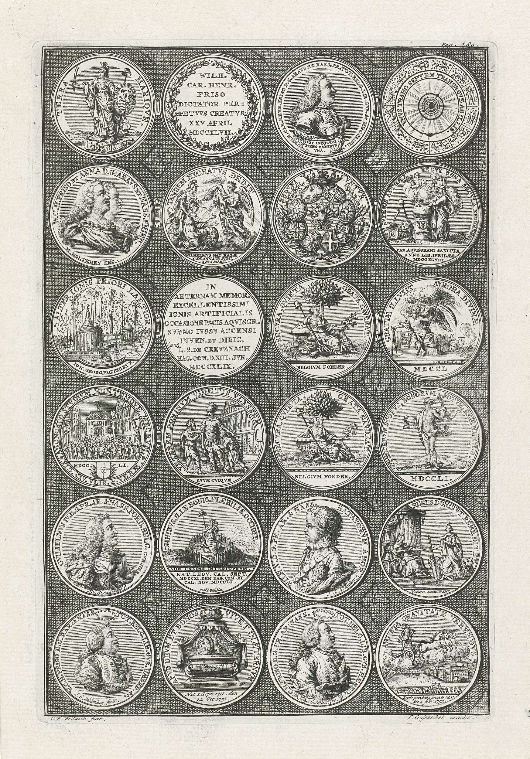Blad met beide zijden van twaalf verschillende gedenkpenningen op stadhouder Willem IV uit de jaren 1747-1752. Gemerkt rechtsboven: Pag. 269. Bij de plaat behoort een apart blad met de verklaring.