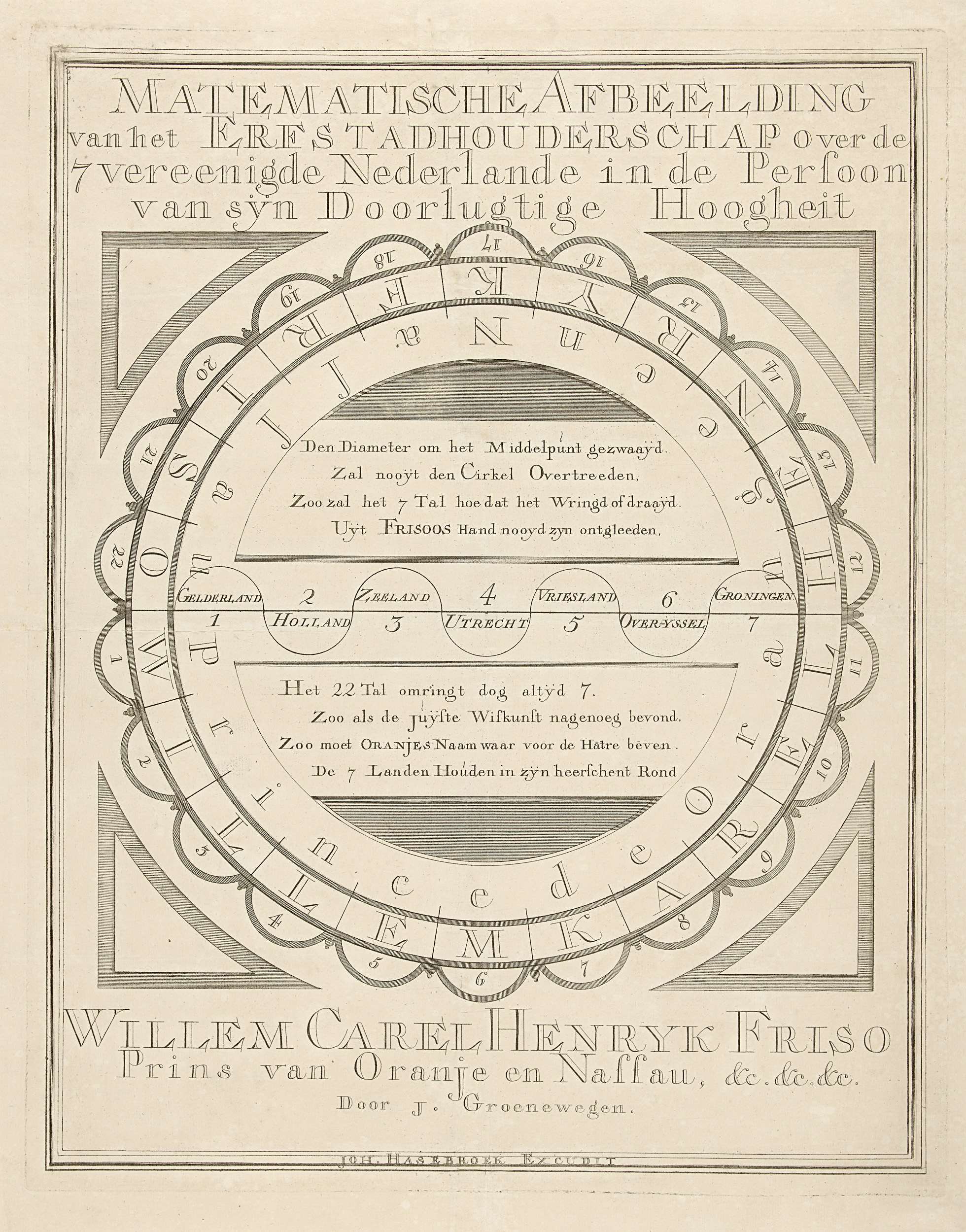 Mathematische voorstelling van de verkiezing van Willem IV tot erfstadhouder waarin de vereenzelviging van de zeven provincies in de persoon van de stadhouder wordt verbeeld, mei 1747.