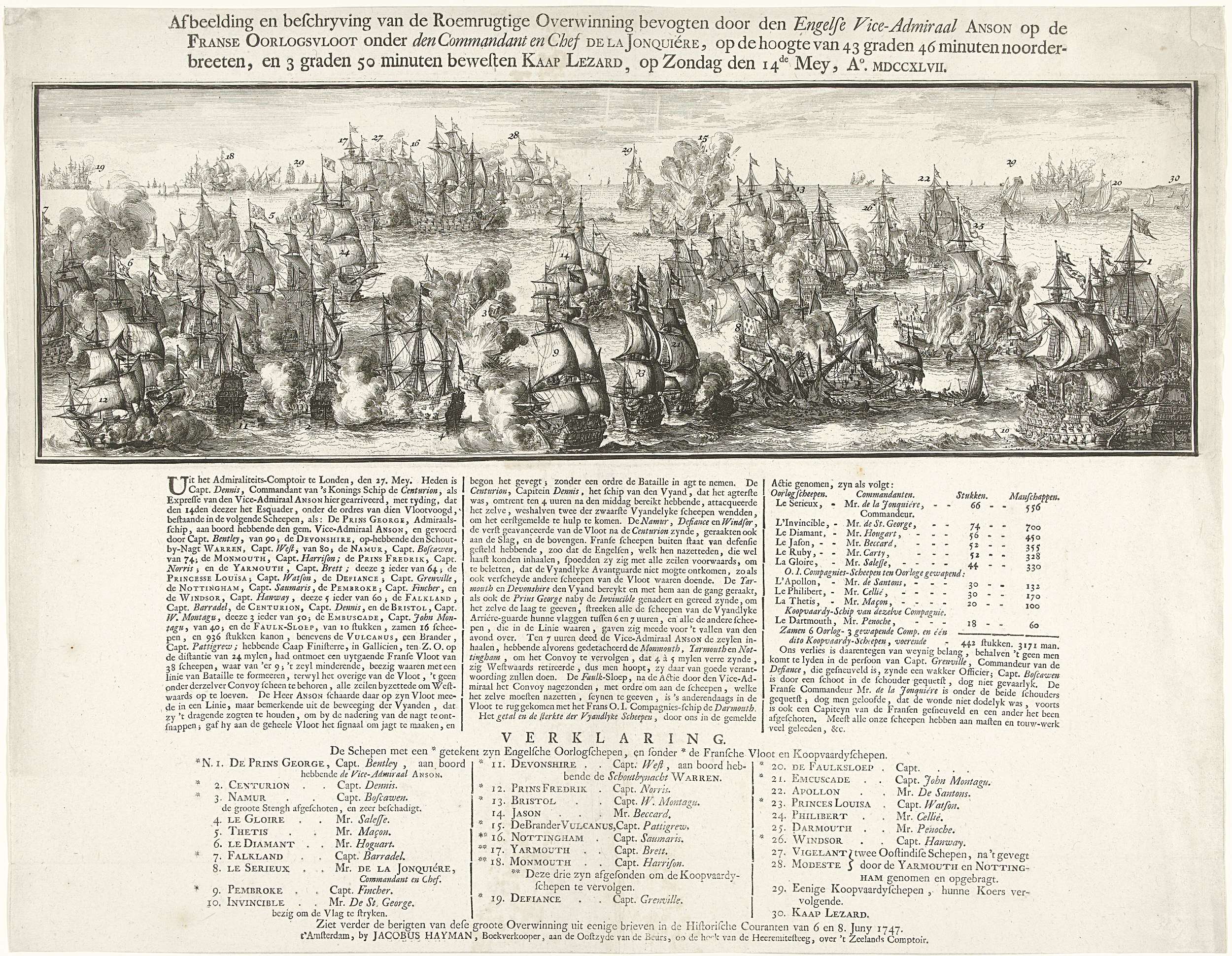 Zeeslag bij Kaap Lezard (Kaap Finisterre) waarbij de Engelse vloot onder admiraal George Anson een overwinning behaalde op de Franse vloot onder admiraal de la Jonquiére, 14 mei 1747. Op het blad onder de plaat een beschrijving van de slag in drie kolommen met een lijst van de genomen Franse schepen met aantallen geschut en ...