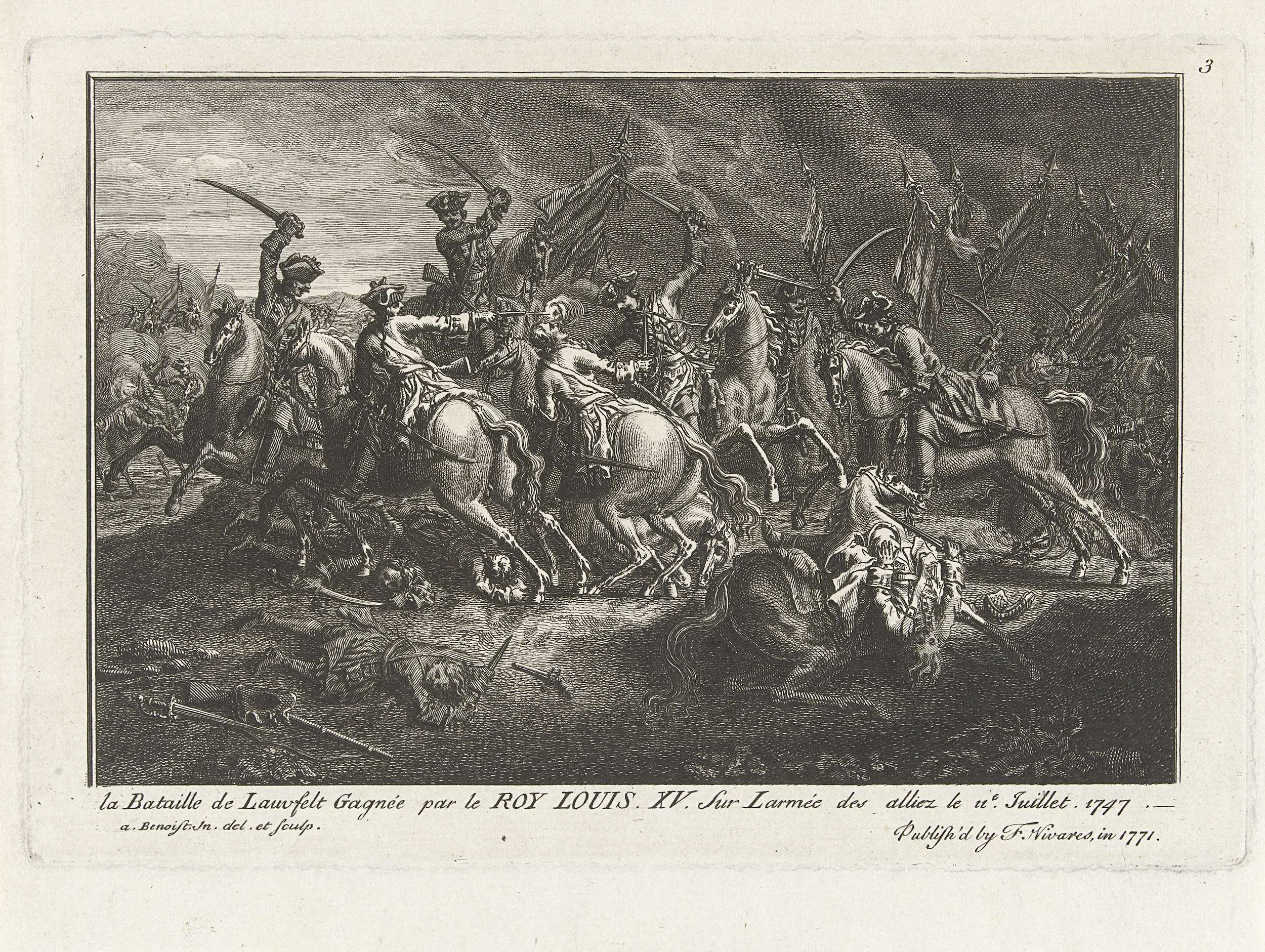 Slag bij Lafelt waarbij de Fransen een overwinning behaalden op de Geallieerden, 2 juli 1747. Genummerd rechtsboven: 3.