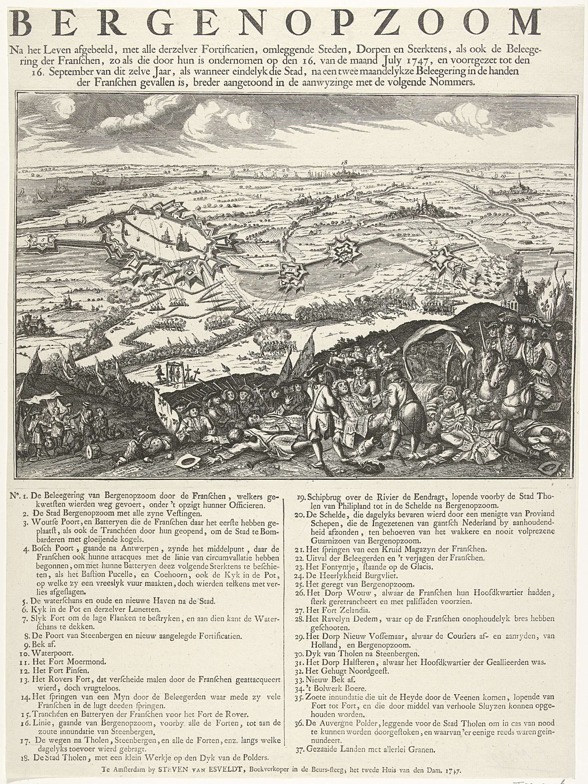Het beleg en bombardement van de stad Bergen op Zoom door het Franse leger onder Löwenthal. Op de voorgrond slachtoffers onder de Franse belegeraars. De stad werd vanaf 12 juli belegerd en was bij het maken van deze staat van de prent uiteindelijk veroverd. Op het blad onder de plaat de legenda 1-37.