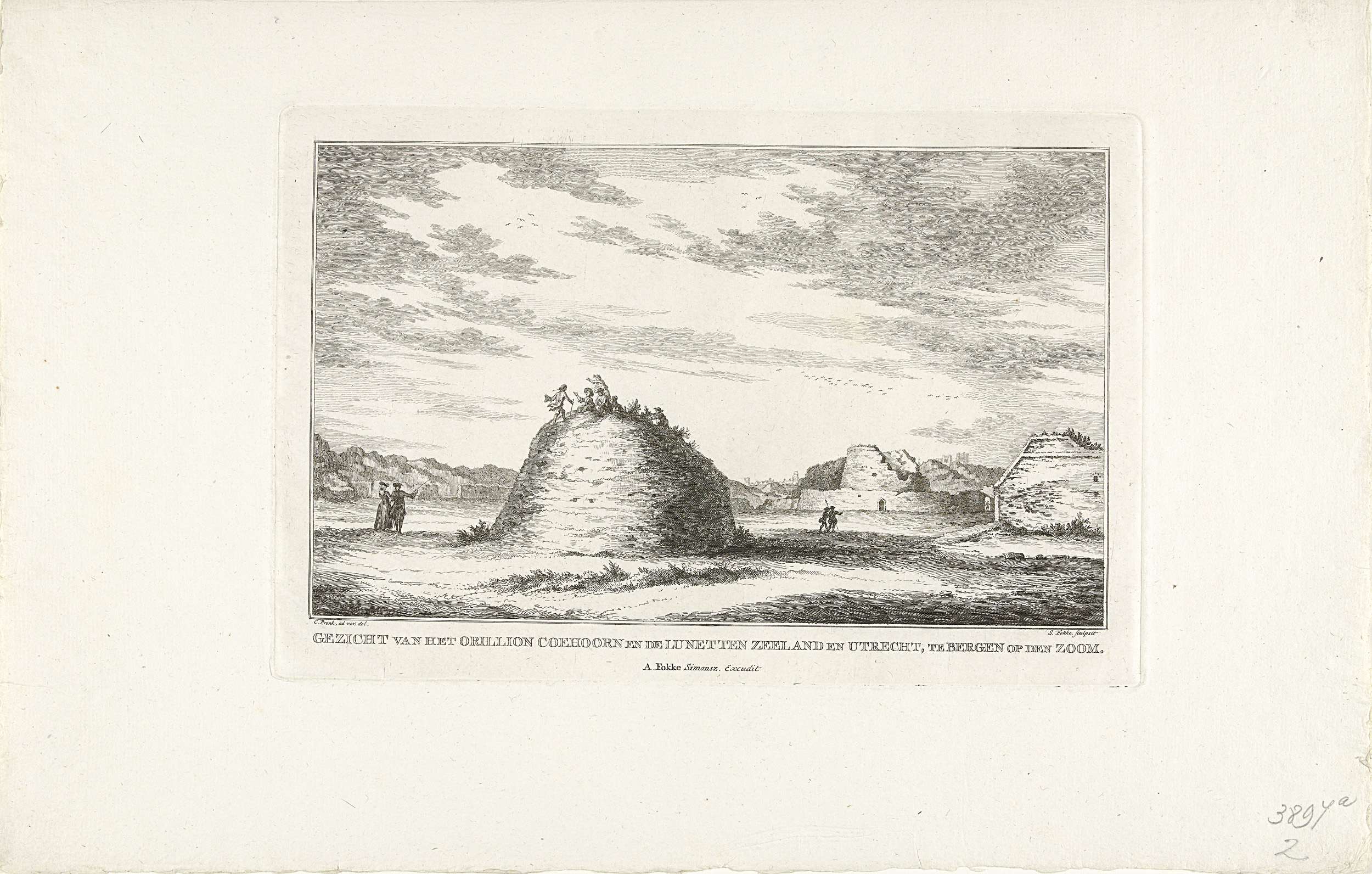 Bezoekers op de ruïnes van de orillon Coehoorn en de lunetten Zeeland en Utrecht, onderdelen van de verwoeste vestingen van Bergen op Zoom. Onderdeel van de reeks met tien gezichten van de ruïnes na het beleg en de verwoesting van Bergen op Zoom door de Fransen in juni-september 1747.