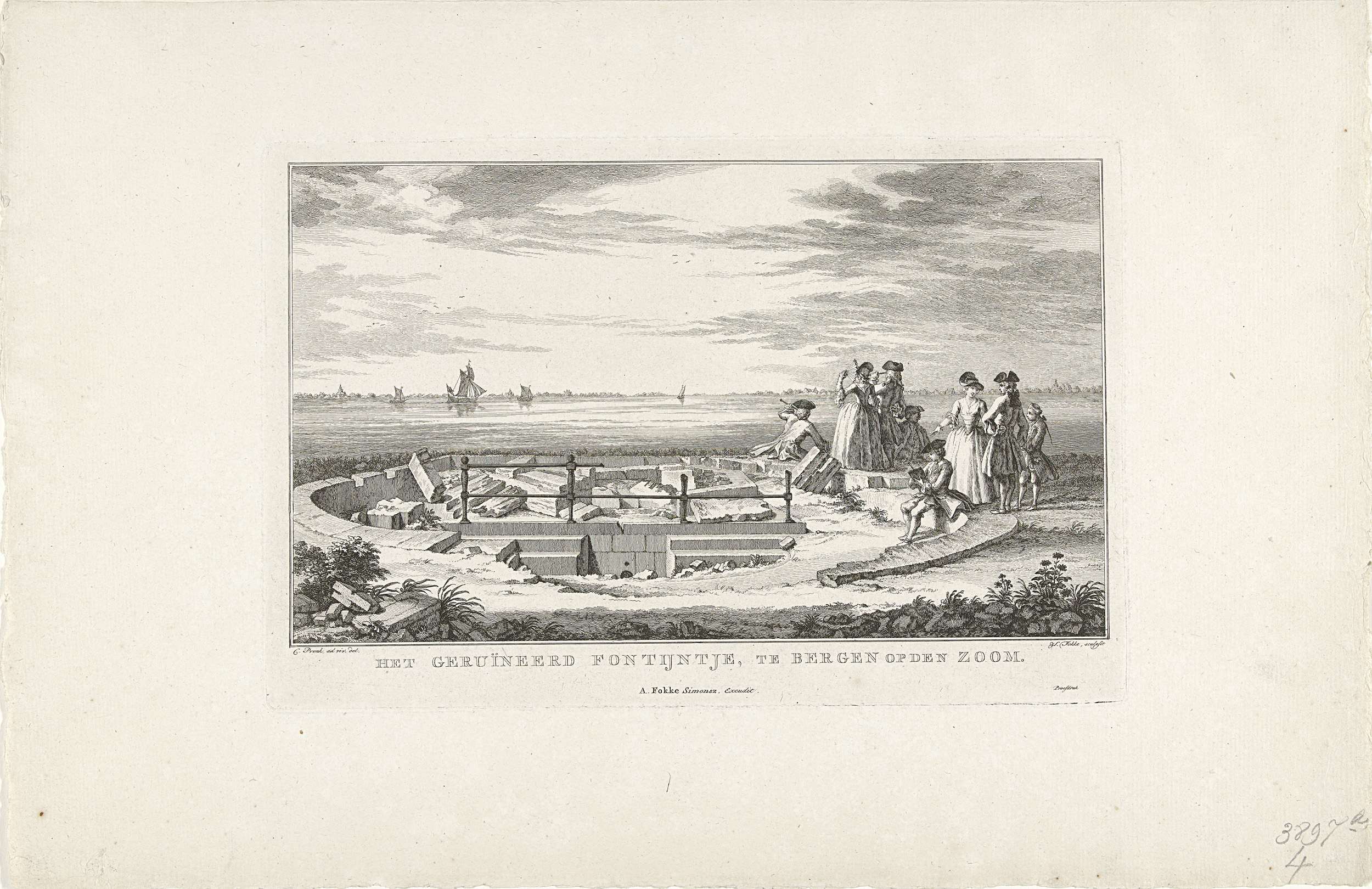 Bezoekers bij de ruïne van het fonteintje te Bergen op Zoom. Onderdeel van de reeks met tien gezichten van de ruïnes na het beleg en de verwoesting van Bergen op Zoom door de Fransen in juni-september 1747.