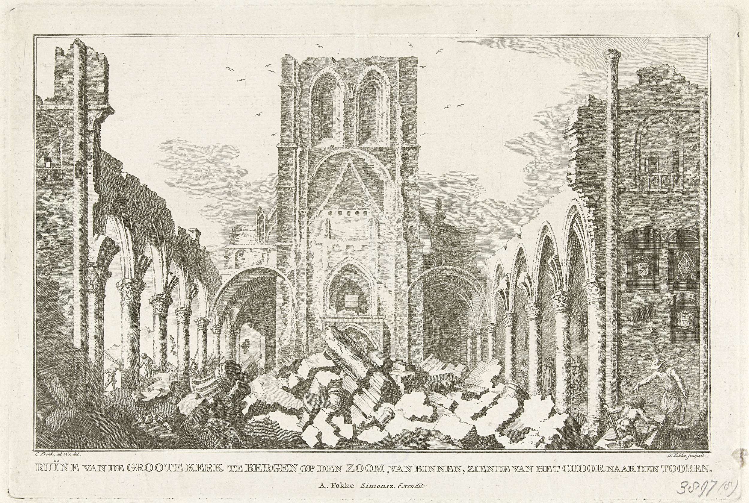 Ruïne van het interieur van de Grote Kerk (Sint-Gertrudiskerk) van Bergen op Zoom in het jaar 1748. Onderdeel van de reeks met tien gezichten van de ruïnes na het beleg en de verwoesting van Bergen op Zoom door de Fransen in juni-september 1747.