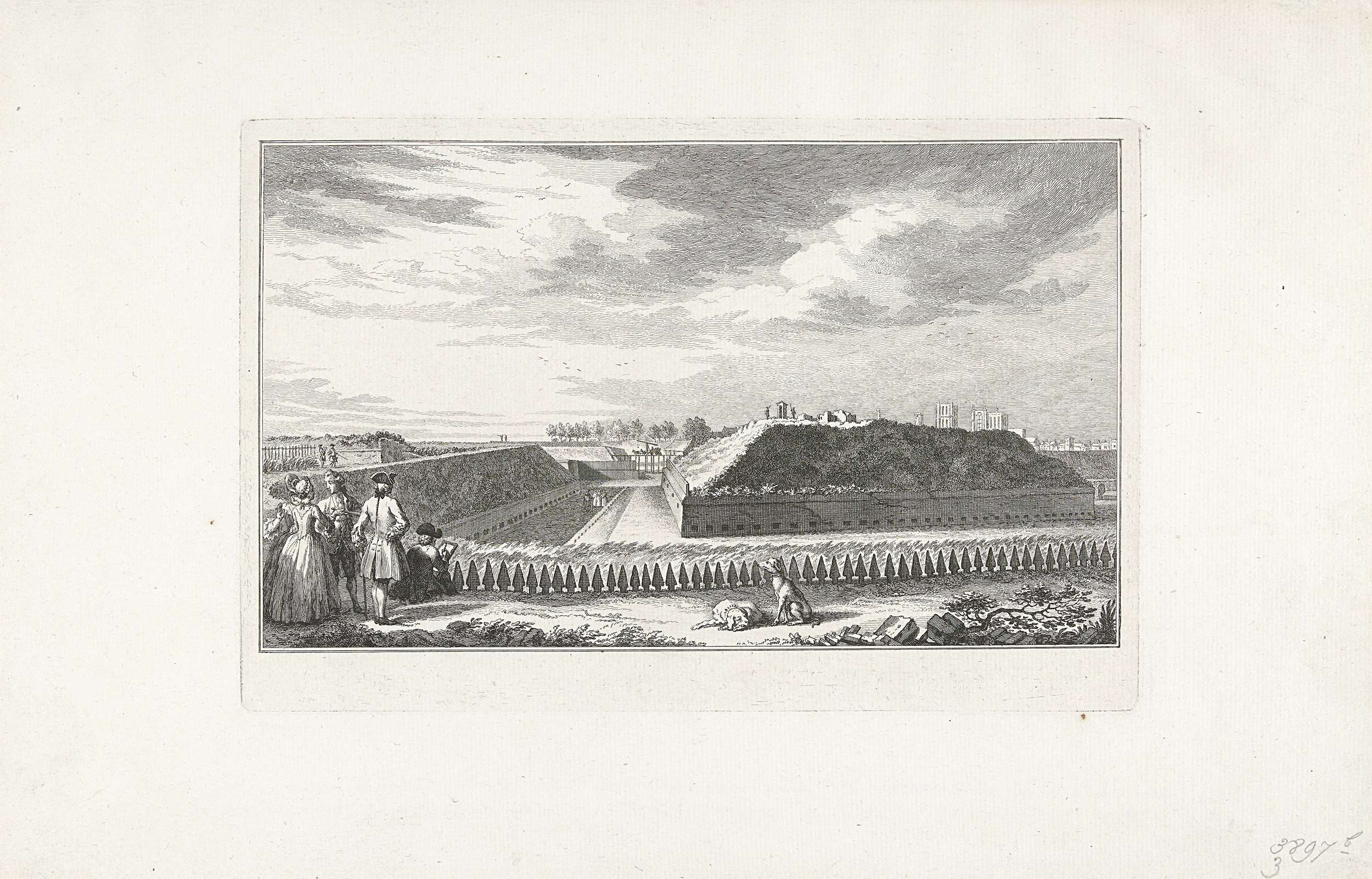 Bezoekers bij de ruïnes van de Bedekte Weg en de bressen in het bastion Coehoorn, onderdelen van de verwoeste vestingen van Bergen op Zoom. Onderdeel van de reeks met tien gezichten van de ruïnes na het beleg en de verwoesting van Bergen op Zoom door de Fransen in juni-september 1747.