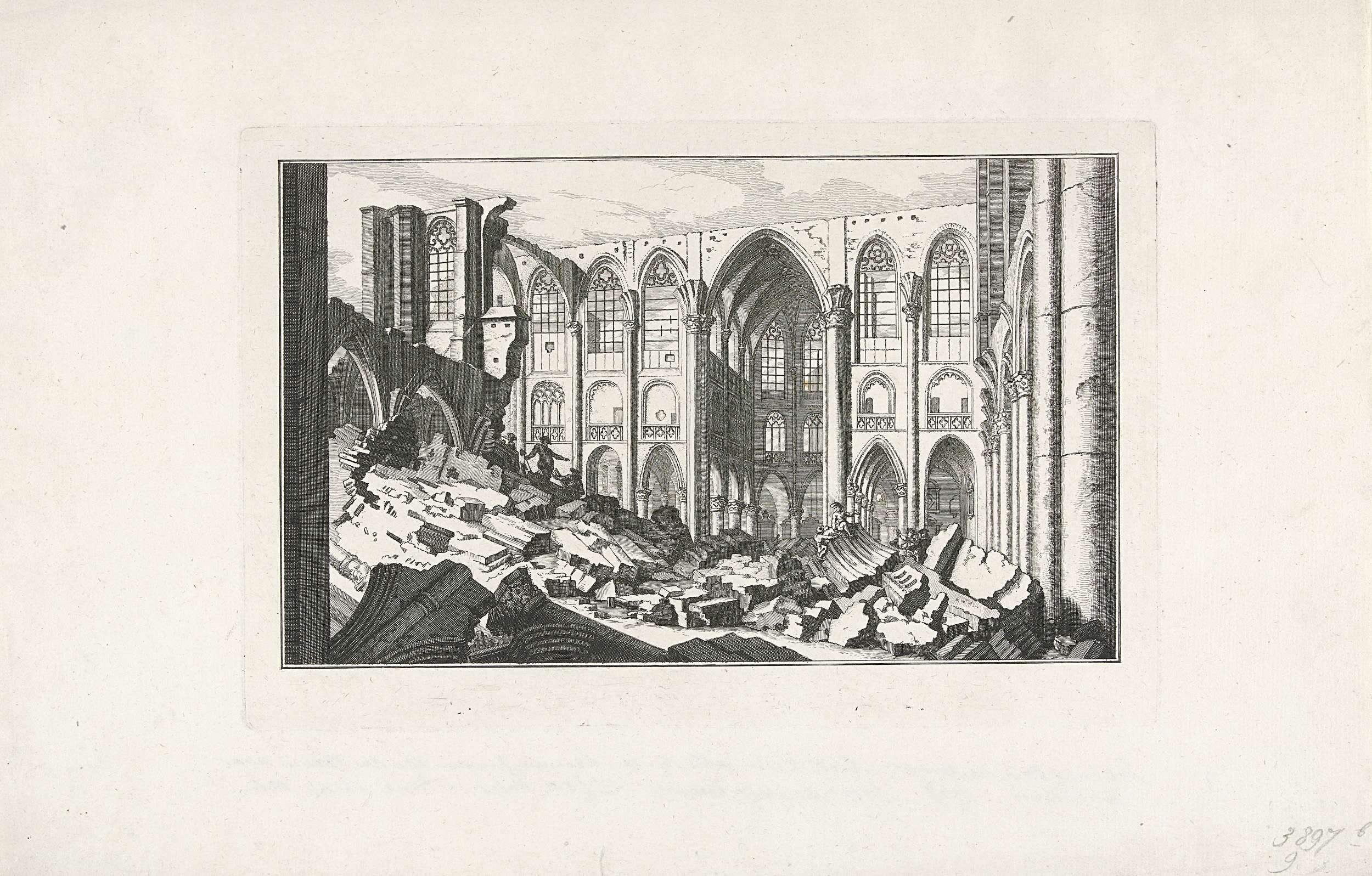 Ruïne van het interieur van de Grote Kerk (Sint-Gertrudiskerk) van Bergen op Zoom in het jaar 1748. Onderdeel van de reeks met tien gezichten van de ruïnes na het beleg en de verwoesting van Bergen op Zoom door de Fransen in juni-september 1747.