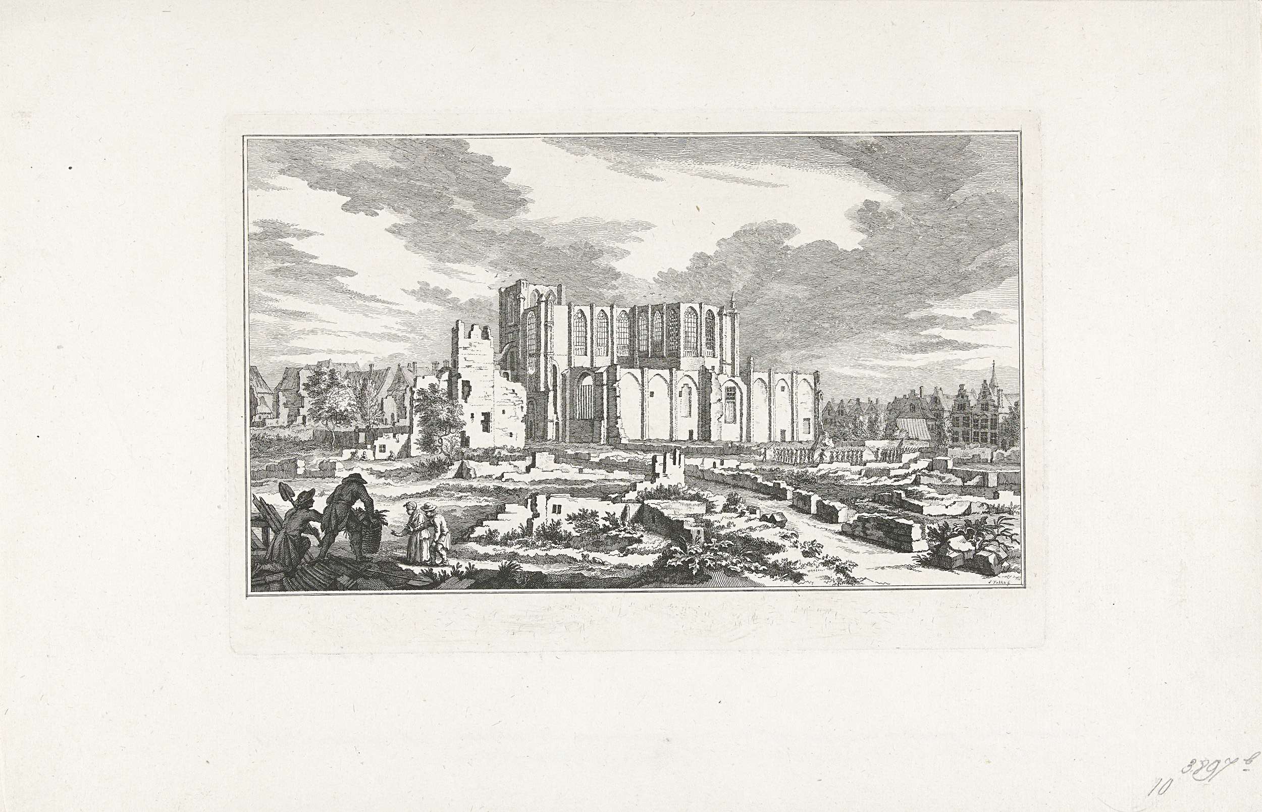 Ruïne van de Grote Kerk (Sint-Gertrudiskerk) van Bergen op Zoom, gezien van achteren in het jaar 1748. Onderdeel van de reeks met tien gezichten van de ruïnes na het beleg en de verwoesting van Bergen op Zoom door de Fransen in juni-september 1747.