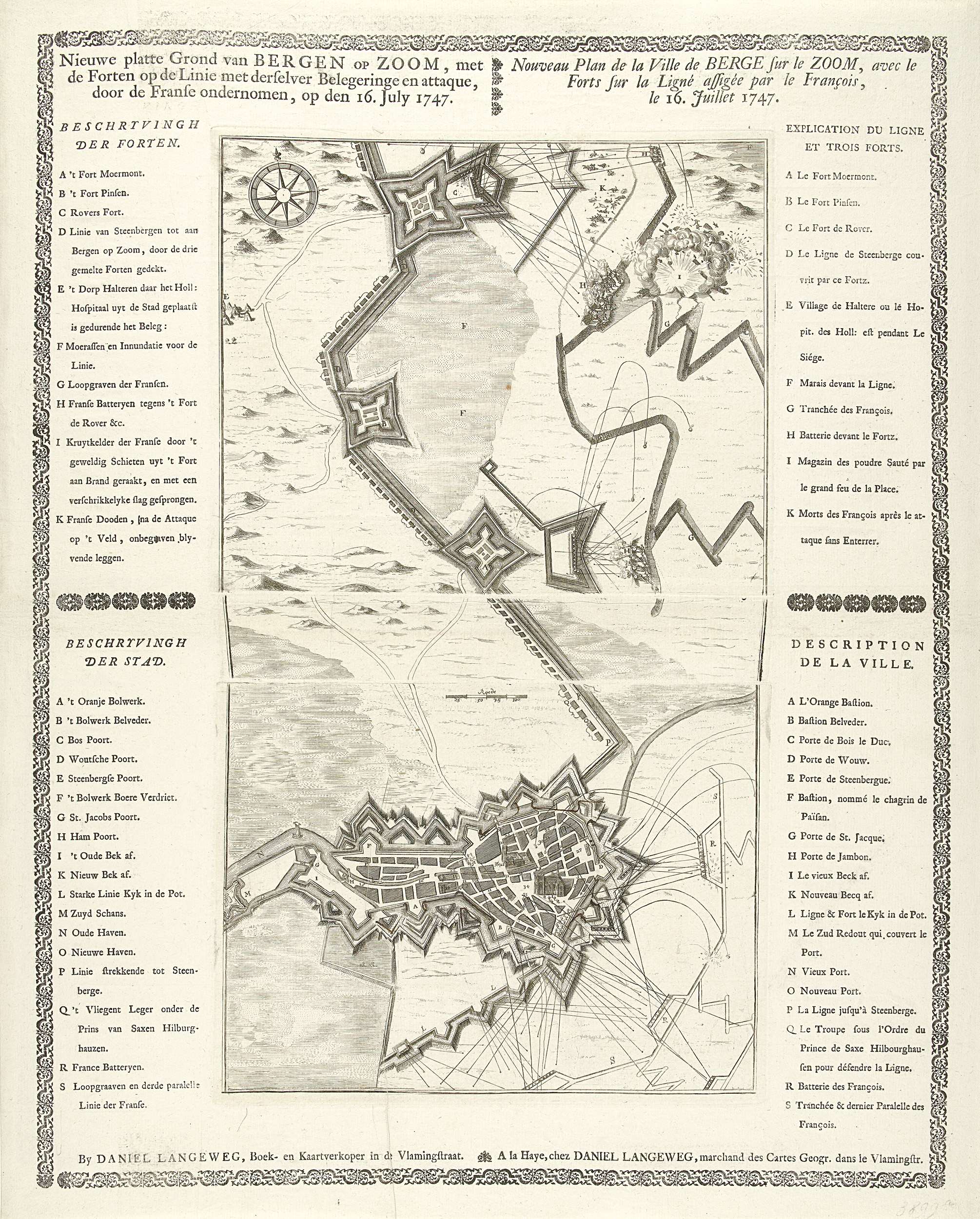 Plattegrond van het beleg van Bergen op Zoom door de Fransen, aangevangen op 12 juli 1747. Kaart gedrukt van drie platen met aan weerszijden de legenda's in het Nederlands en Frans, het geheel in een decoratieve rand.
