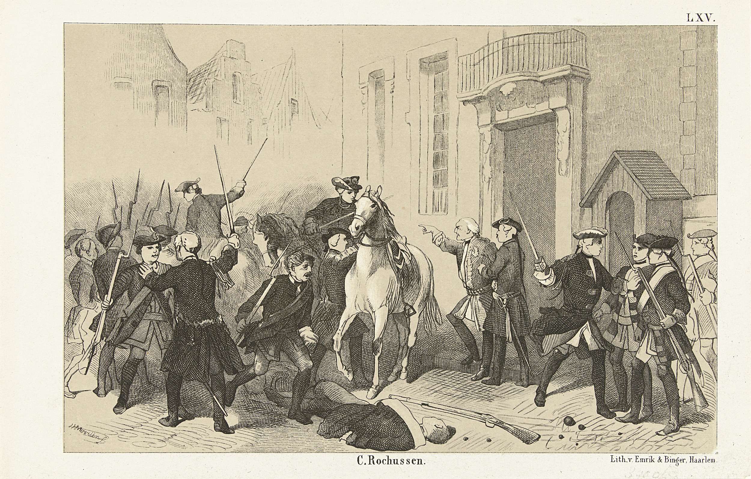 Bergen op Zoom verrast door de aanval van de Fransen, juli 1747. Soldaten en officieren maken zich in allerijl klaar voor de verdediging van de stad. Genummerd rechtsboven: LXV.