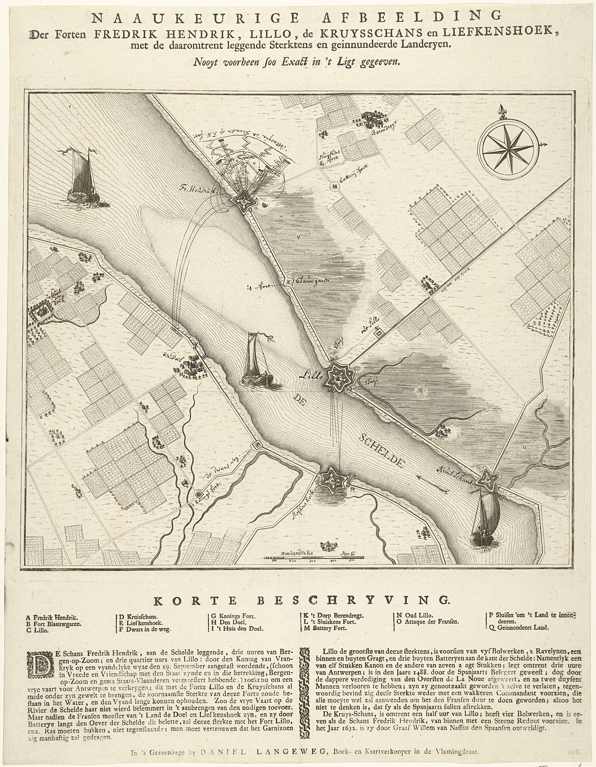 Kaart met de belegering van de Nederlandse forten Frederik Hendrik, Lillo, Kruisschans en Liefkenshoek, gelegen aan de Schelde, door de Fransen tussen 1 en 14 oktober 1747, en de geïnundeeerde gebieden. Met opschriften in pen in de voorstelling. Op het blad onder de plaat een beschrijving van de forten in twee kolommen.