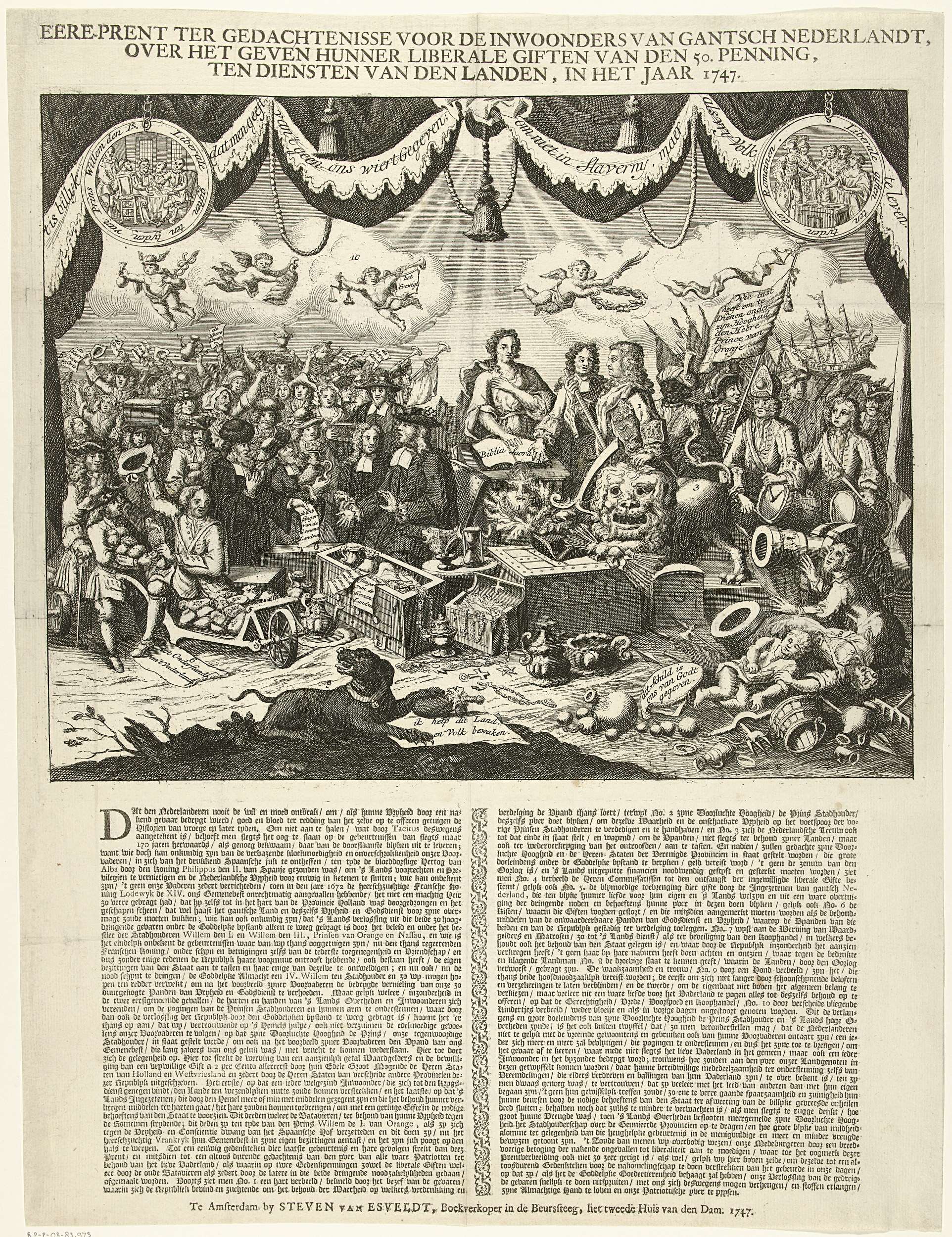 Allegorie op Liberale Gifte van de vijftigste penning gevraagd in 1747 tot steun van het in oorlog verkerende land. Centraal de personificatie van de Vrijheid bij de Nederlandse Leeuw en Prins Willem IV. Hieromheen allerlei allegorische figuren, links het juichende Nederlandse volk, rechts slachtoffers van de oorlog. Op het blad onder de plaat een tekst ...