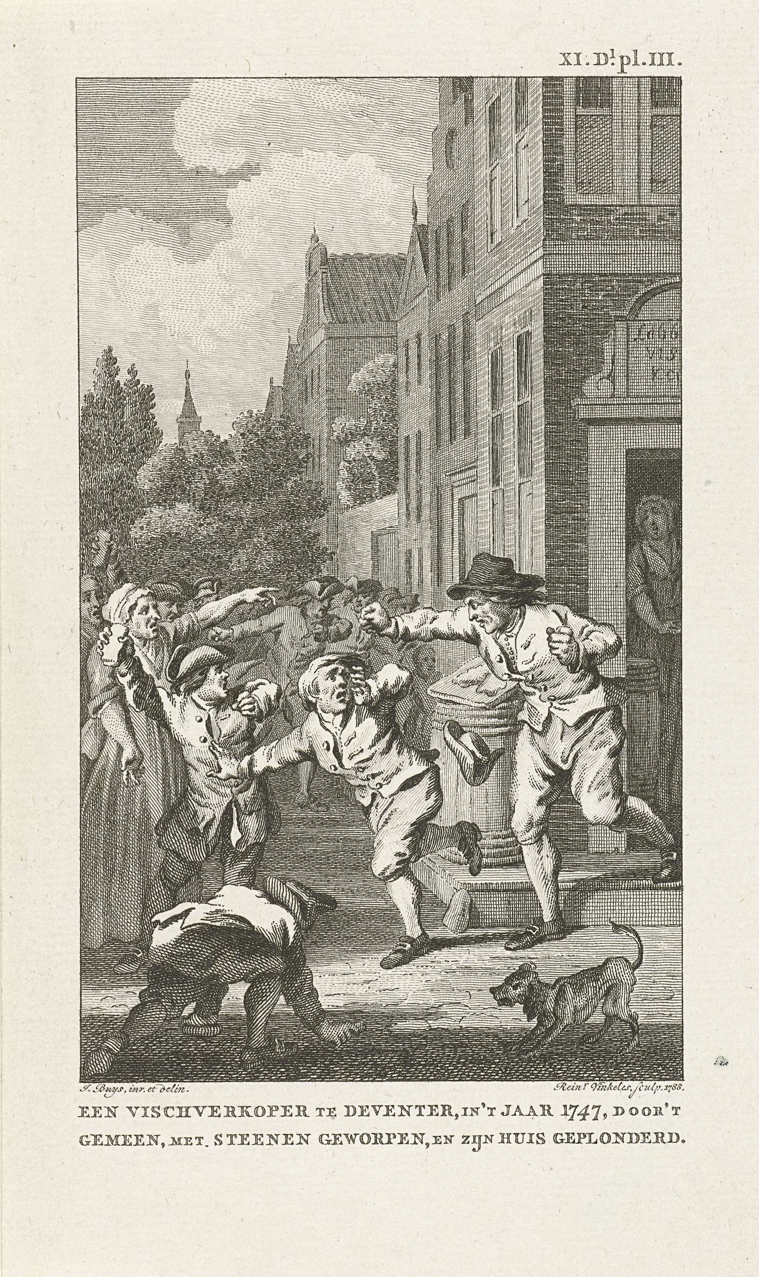 Een Fransgezinde visverkoper te Deventer mishandeld en zijn huis geplunderd door oproerkraaiers, 20 september 1747. Gemerkt rechtsboven: XI. Dl. pl. III.