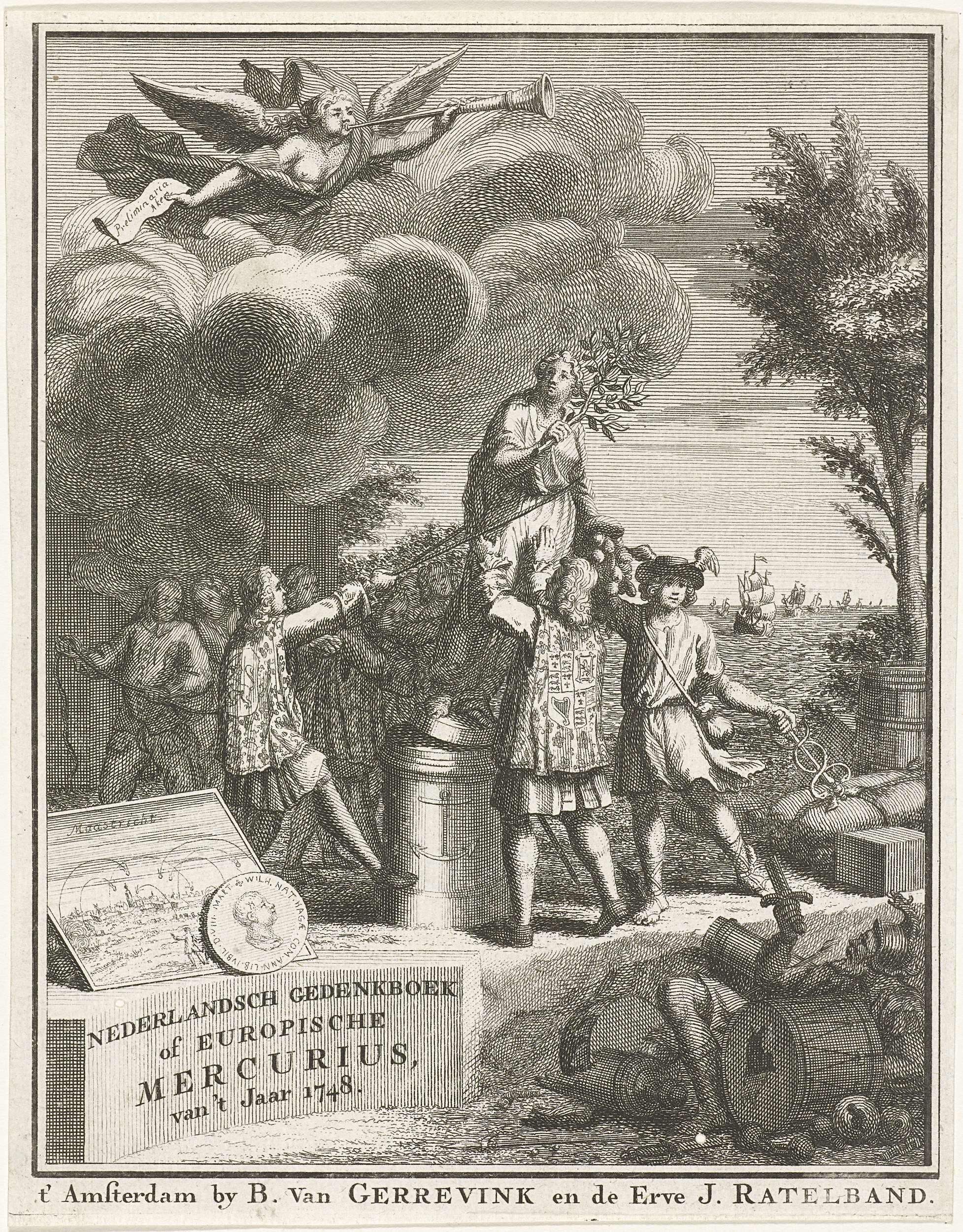 Titelpagina voor het Nederlandsch Gedenkboek of Europische Mercurius, over het jaar 1748. Mercurius ziet zittend toe hoe Nederland en Engeland het standbeeld van de Vrede weer op haar sokkel zetten.