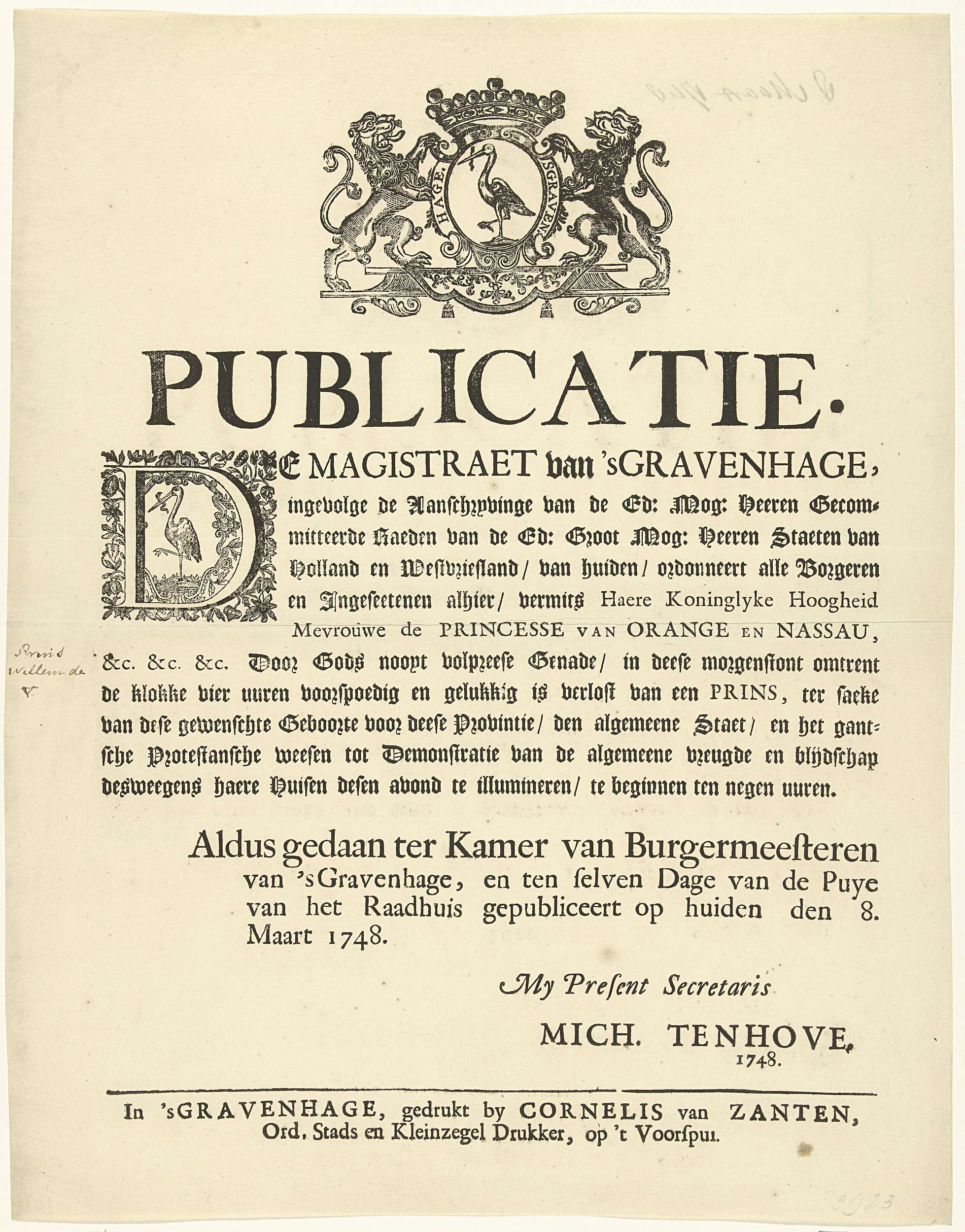 Bekendmaking van de verlening van toestemming door het stadsbestuur van Den Haag om te mogen illumineren op 8 maart 1748 ter gelegenheid van de geboorte van prins Willem V. Bovenaan het stadswapen, de tekst begint met een versierde initiaal D.