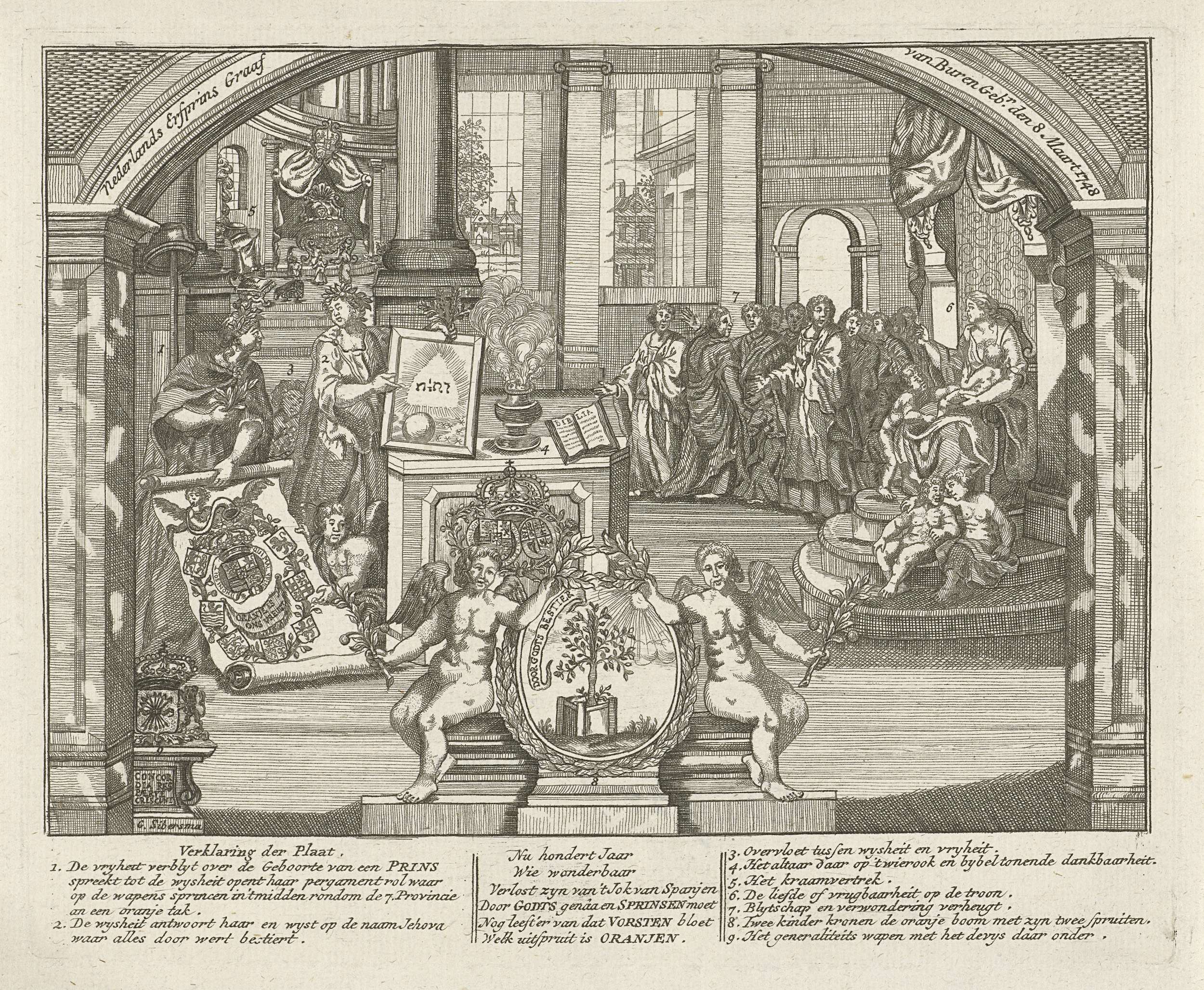 Allegorie op de geboorte van Willem V, de graaf van Buren, prins van Oranje, 8 maart 1748. Interieur met links de Vrijheid en de Wijsheid, rechts de Liefde op de troon, centraal twee putti met een embleem met de Oranjeboom. In het onderschrift in de plaat de verklaring van de cijfers 1-9.
