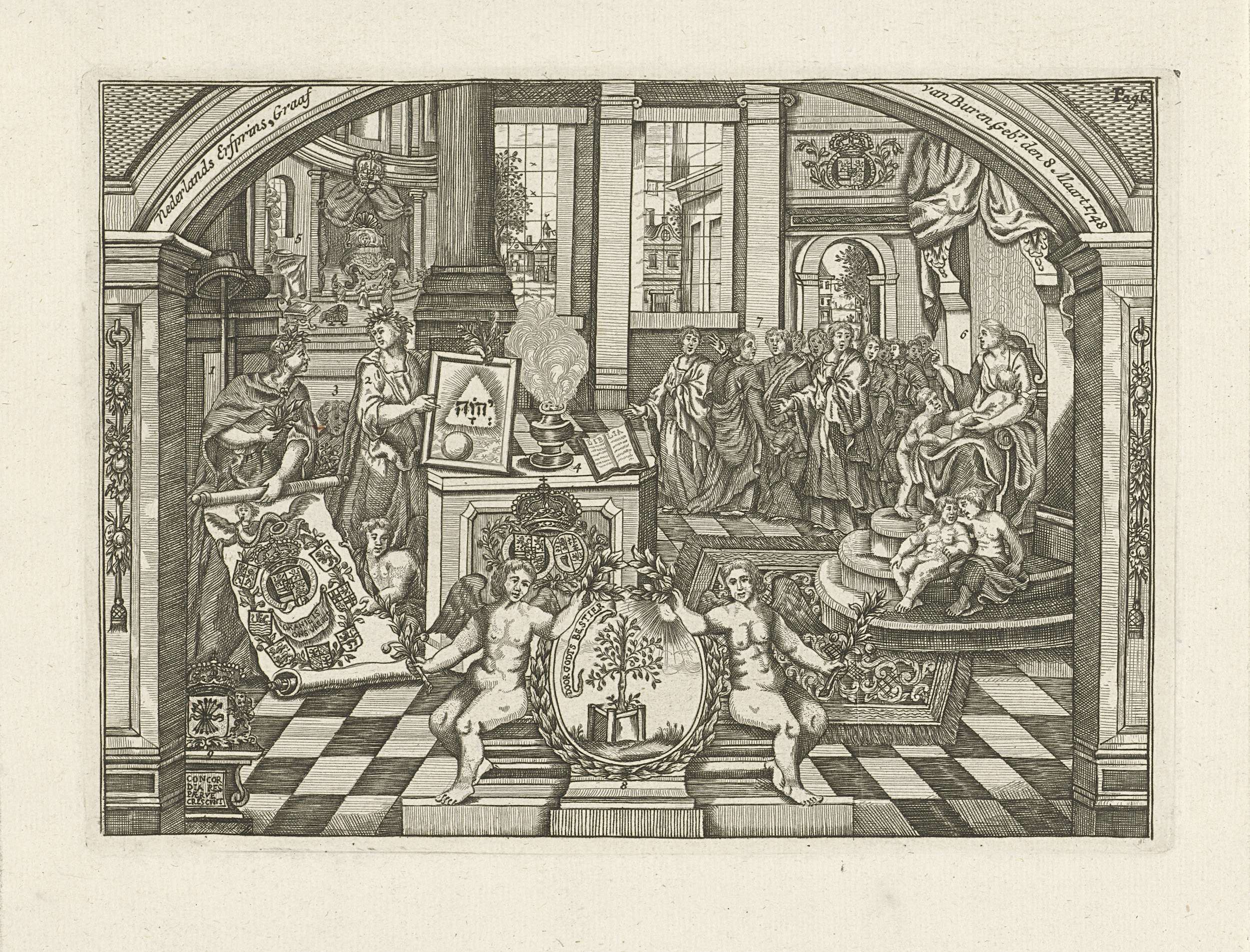 Allegorie op de geboorte van Willem V, de graaf van Buren, prins van Oranje, 8 maart 1748. Interieur met links de Vrijheid en de Wijsheid, rechts de Liefde op de troon, centraal twee putti met een embleem met de Oranjeboom. Gemerkt rechtsboven: Pag. 6.