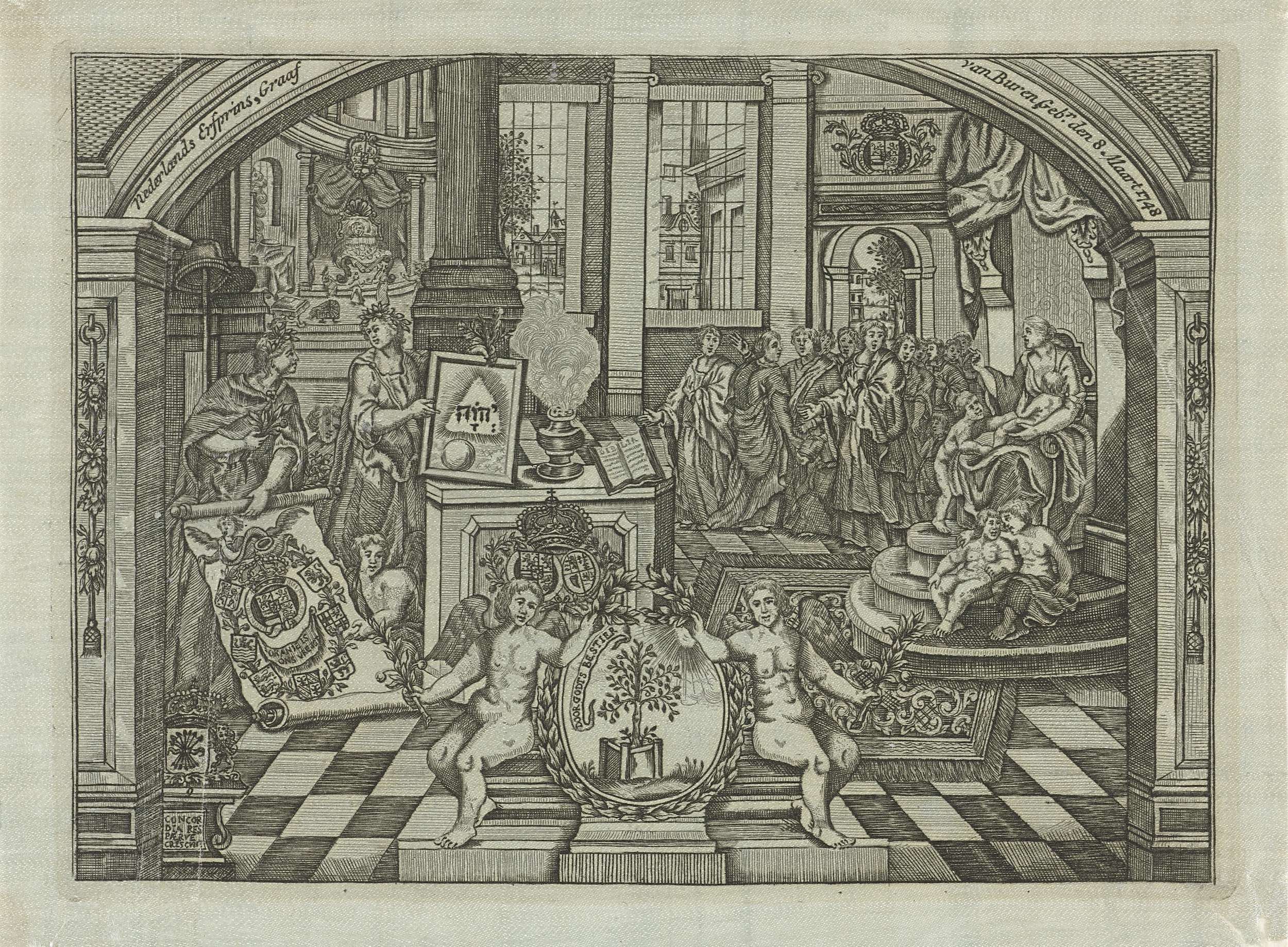 Allegorie op de geboorte van Willem V, de graaf van Buren, prins van Oranje, 8 maart 1748. Interieur met links de Vrijheid en de Wijsheid, rechts de Liefde op de troon, centraal twee putti met een embleem met de Oranjeboom.