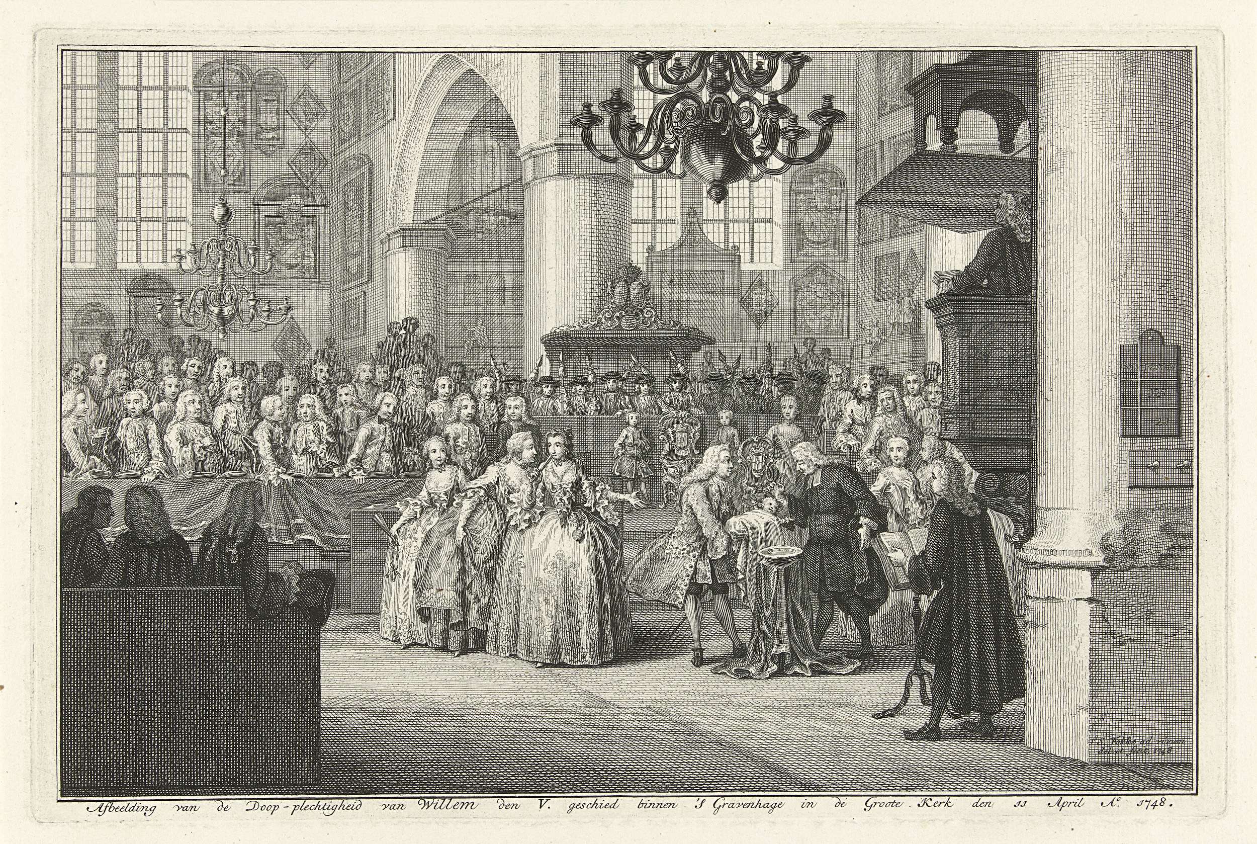 Doopceremonie van prins Willem V in de Grote Kerk te Den Haag, 11 april 1748. Willem IV houdt het kind tijdens het dopen vast, links kijkt de prinses met hofdames toe. Kerkinterieur met vele gasten.
