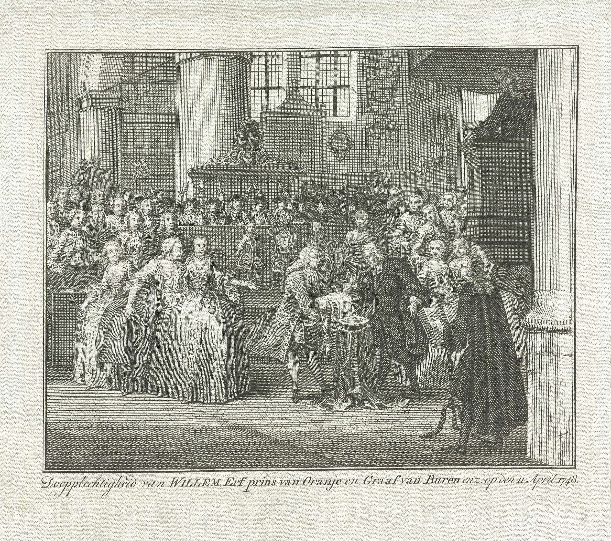 Doopceremonie van prins Willem V in de Grote Kerk te Den Haag, 11 april 1748. Willem IV houdt het kind tijdens het dopen vast, links kijkt de prinses met hofdames toe.