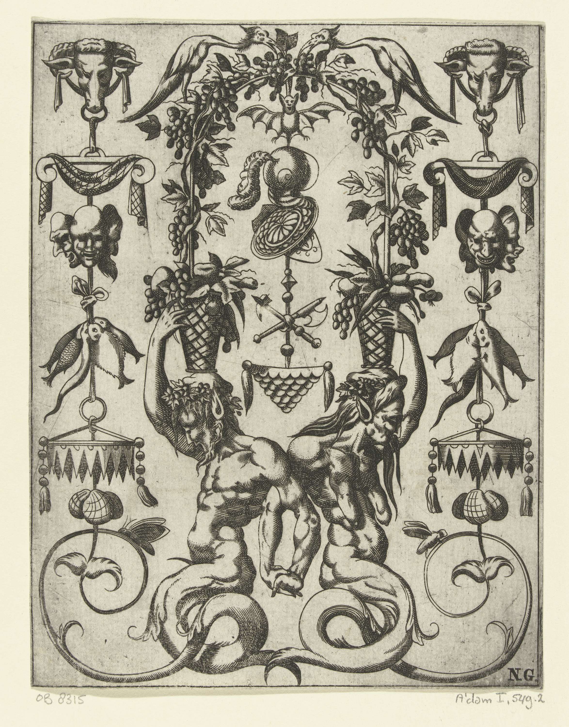 Midden onder zitten rug aan rug een mannelijke en een vrouwelijke sater