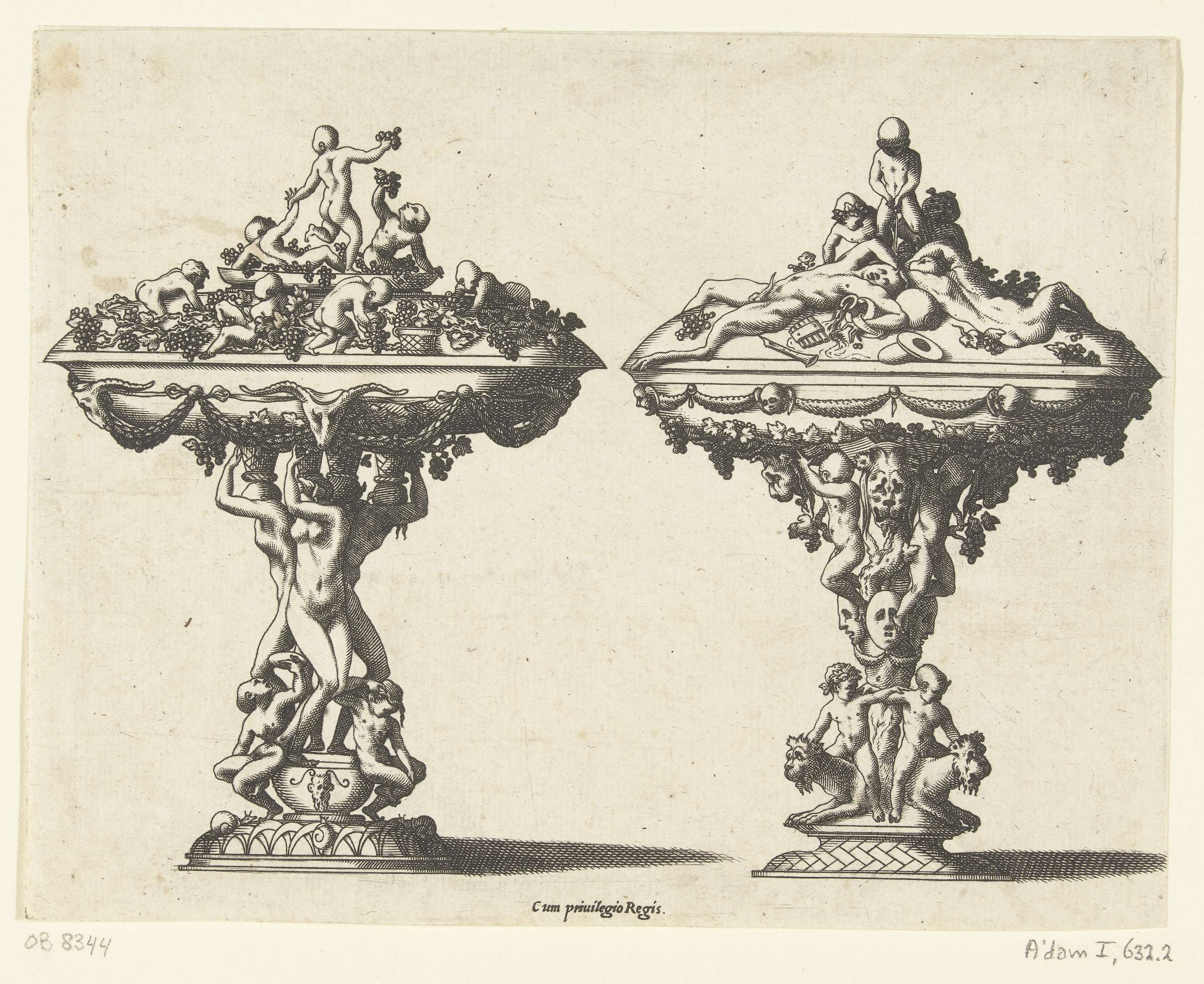 De stam van de linker drinkschaal bestaat uit vier naakte figuren met kinderen aan hun voeten. Het deksel is gedecoreerd met kindertjes die druiven plukken. De stam van de rechter drinkschaal bestaat uit een stronk, gedecoreerd met mascarons, waarop kinderen zitten. Het deksel is gedecoreerd met saters en kindertjes.