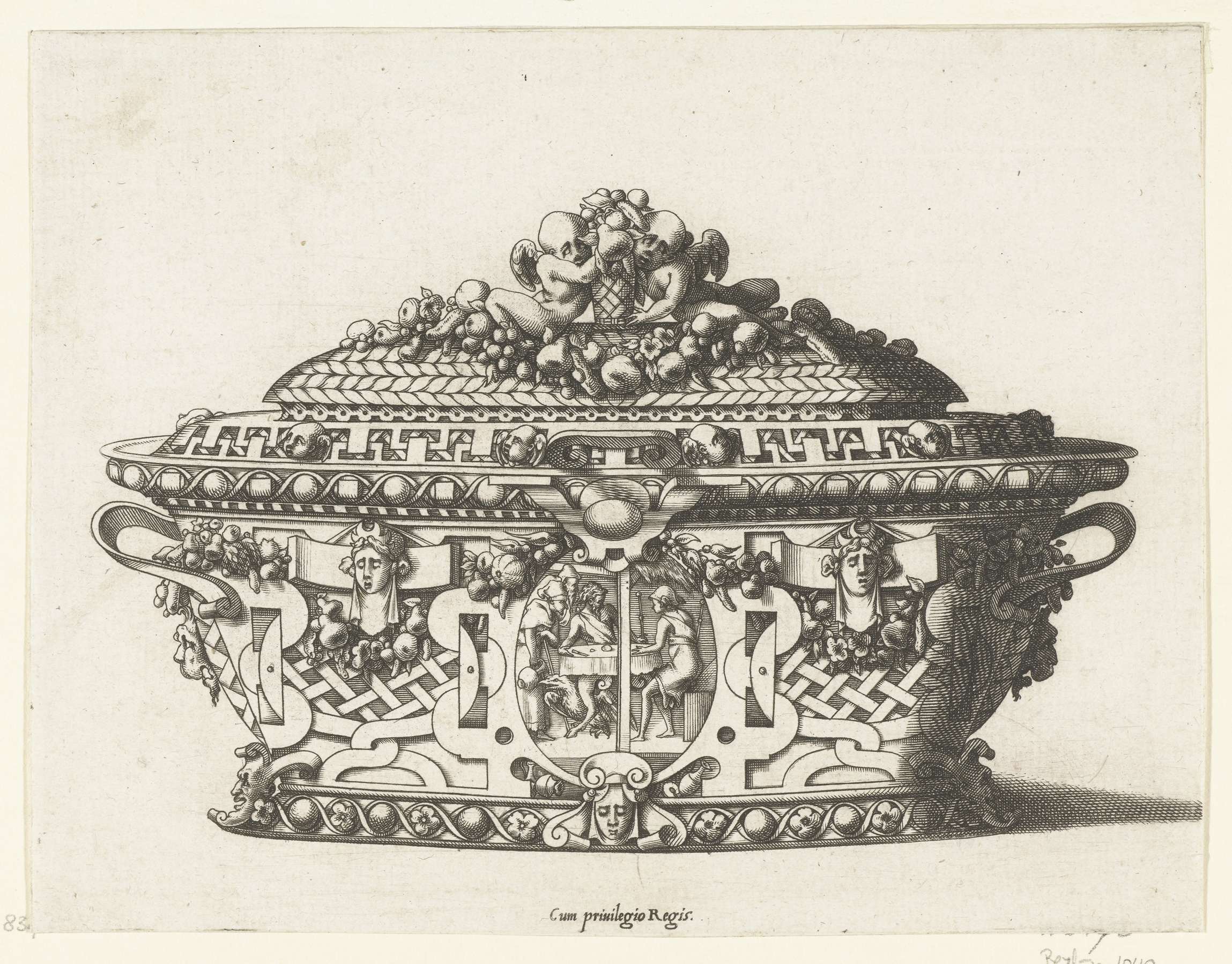 De terrine is gedecoreerd met rolwerk, guirlandes, mascarons en een voorstelling van Jupiter en Mercurius bij Philemon en Baucis. Op het deksel liggen twee putti, omringd door guirlandes.