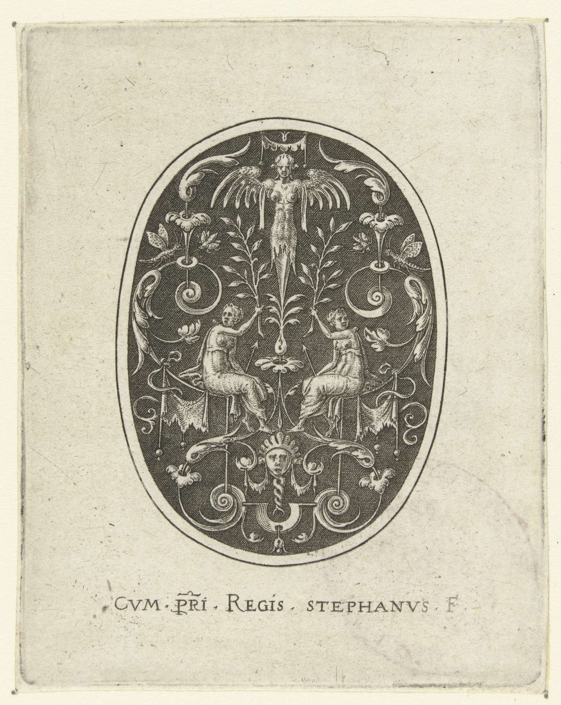Twee vrouwen aan de voet van een gevleugelde vrouwelijke herme