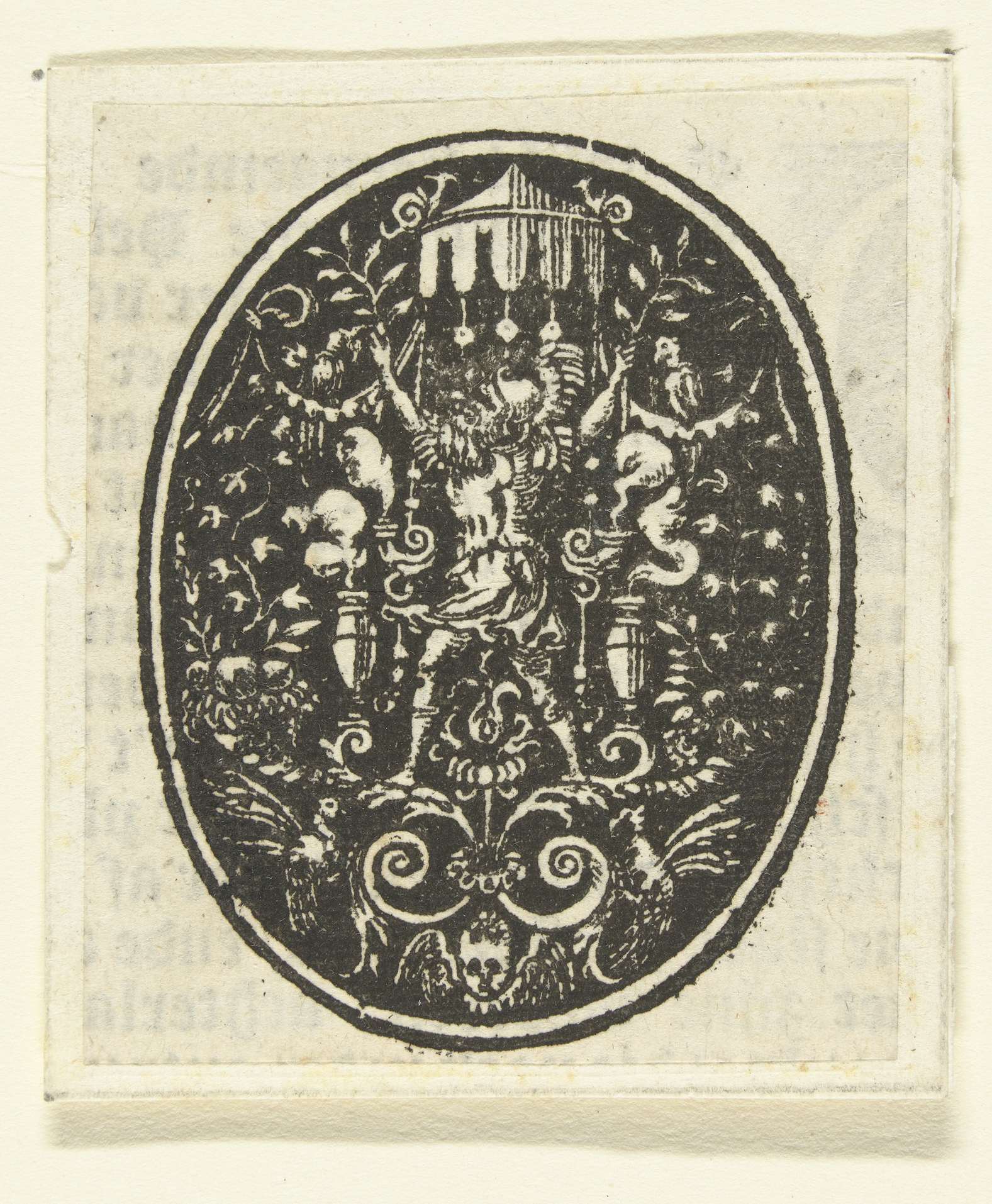 Tegenzijdige kopie naar prent van Etienne Delaune. Middenonder hangt een cherubijntje tussen twee vogels.