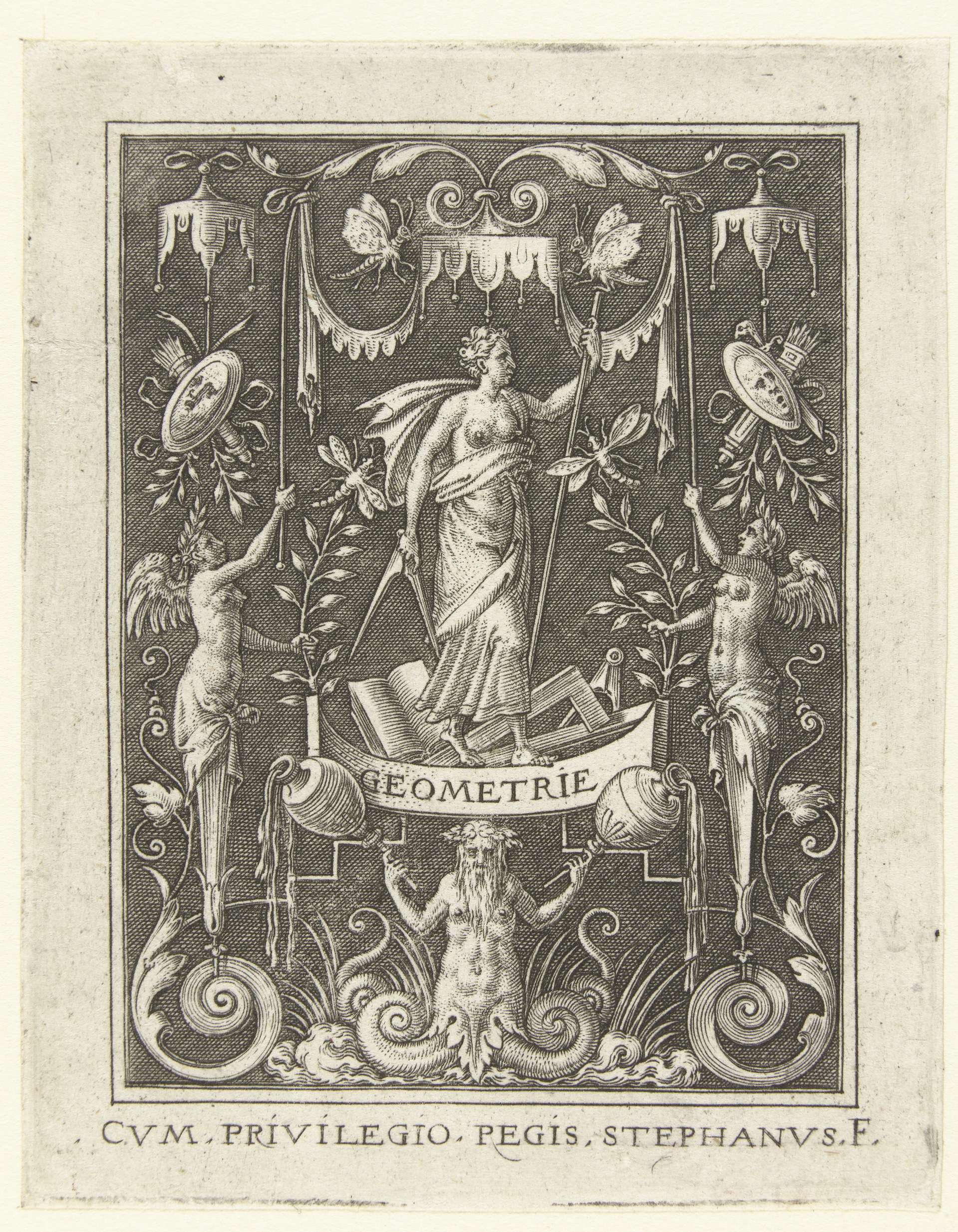 De Geometrie met een passer in de hand. Linksonder en rechtsonder staat een gevleugelde vrouwelijke herme. Uit serie van 6 bladen.