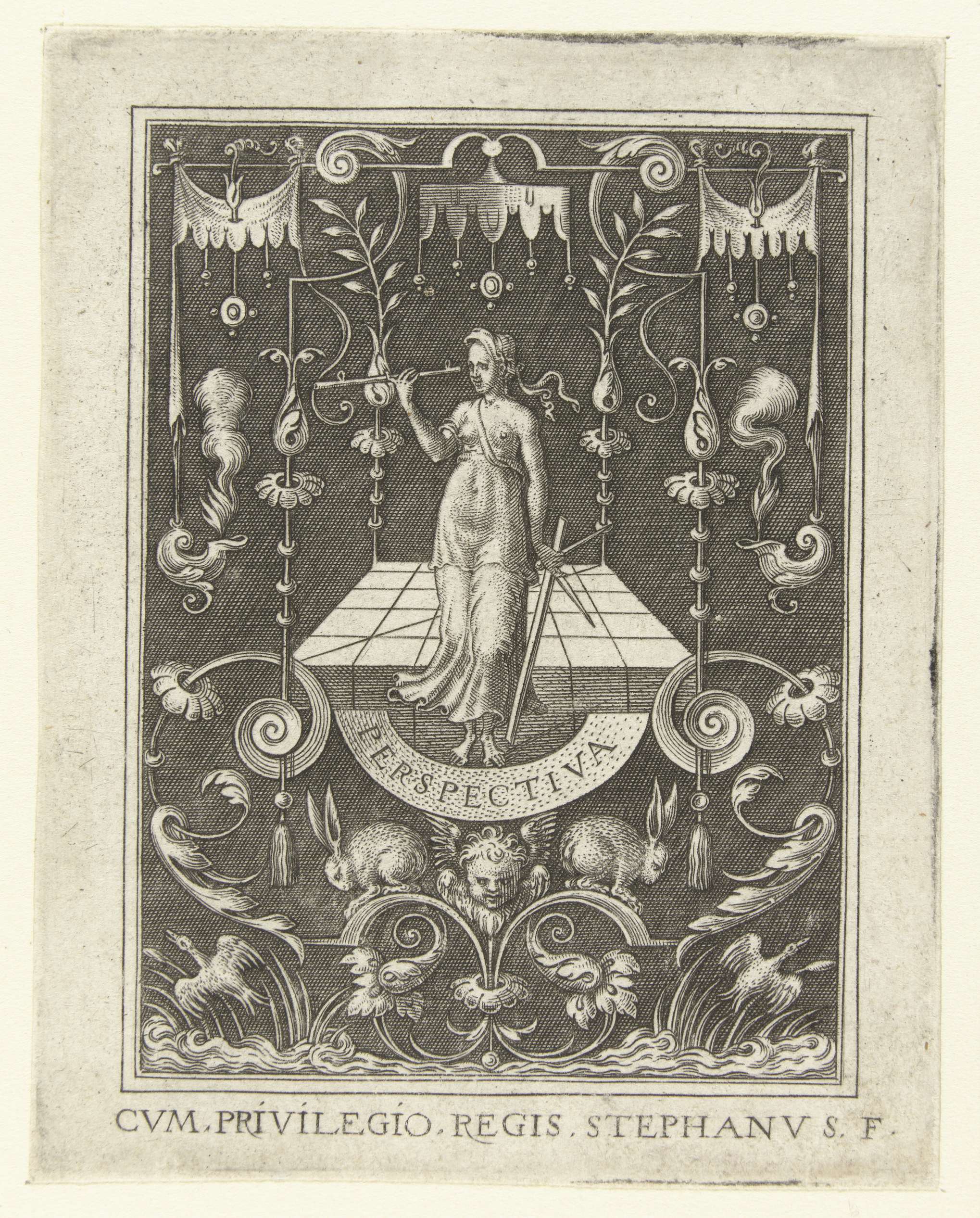 Het Perspectief met meetinstrumenten in de handen staande voor een tegelvloer. Linksonder en rechtsonder vliegt een vogel op uit het riet. Uit serie van 6 bladen.