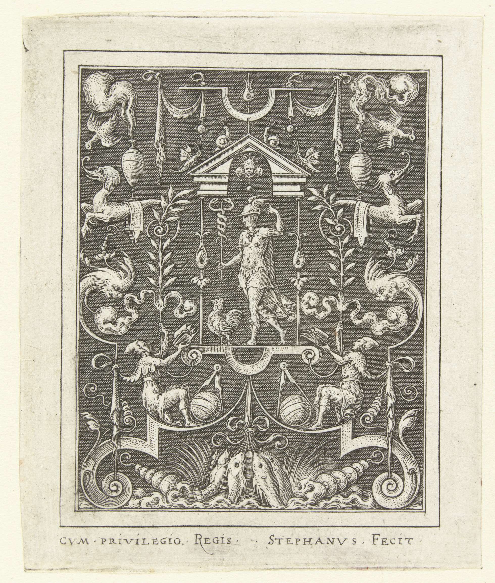Mercurius heeft de caduceus in zijn hand en een haan aan zijn voeten. Uit serie van 6 bladen.