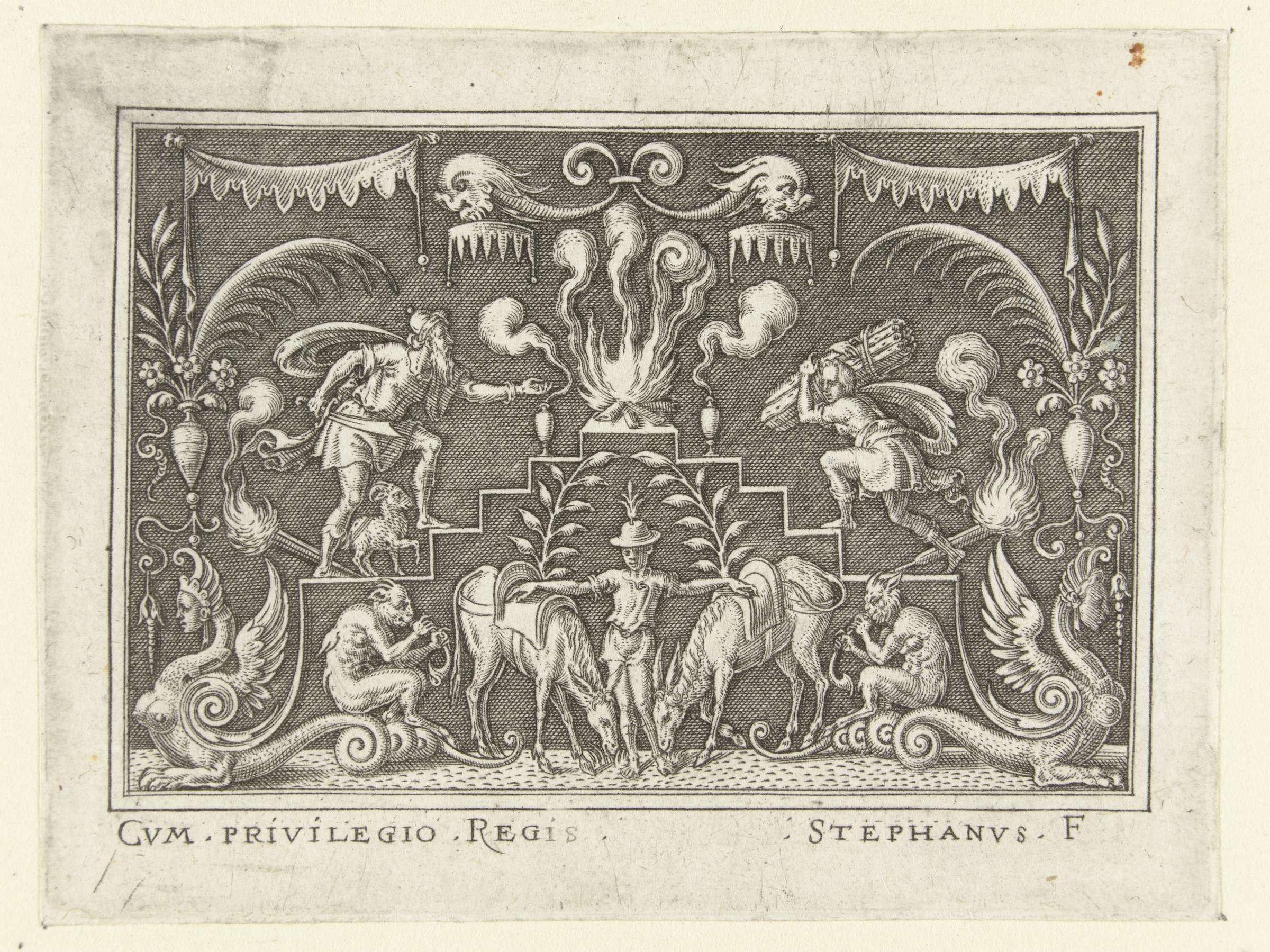 In het midden brandt een vuur op het altaar waar treden naartoe wijzen. Uit serie van 6 bladen.