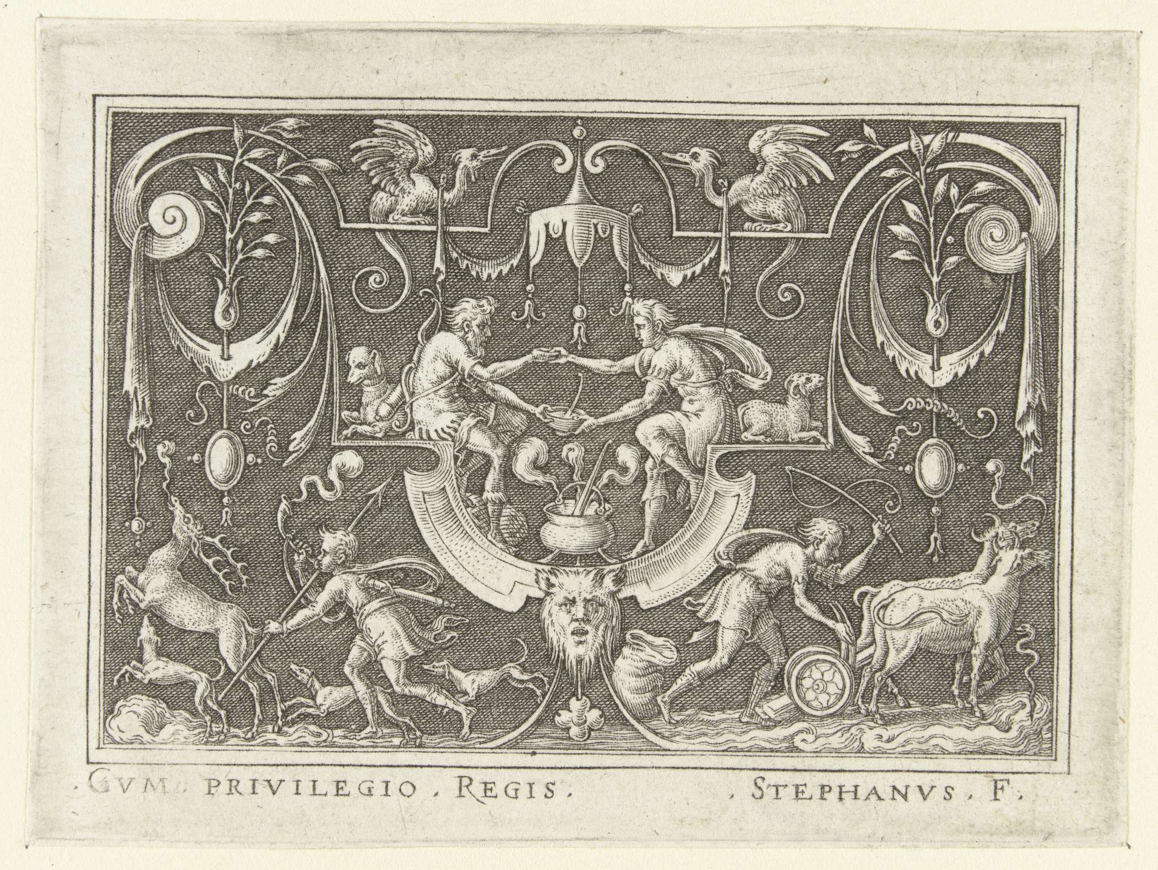 Beiden zitten in het midden tegenover elkaar met een kom in hun handen. Uit serie van 6 bladen.