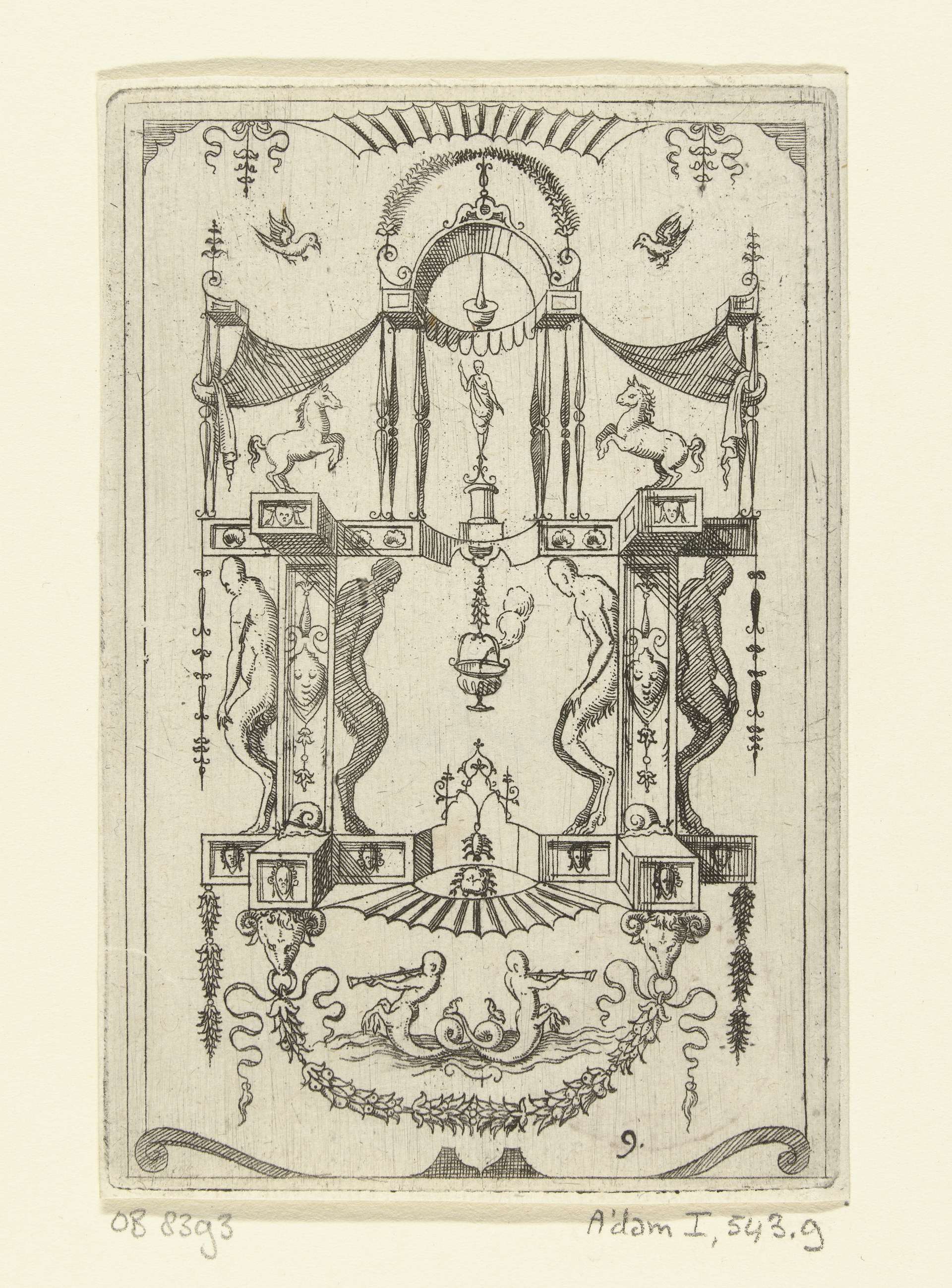 Kopie naar prent van Jacques Androuet Ducerceau, ontleend aan een vlakdecoratie van Enea Vico. Blad uit serie met architectuurfantasieën en grotesken met fabelwezens, guirlandes, kandelabers en mascarons.