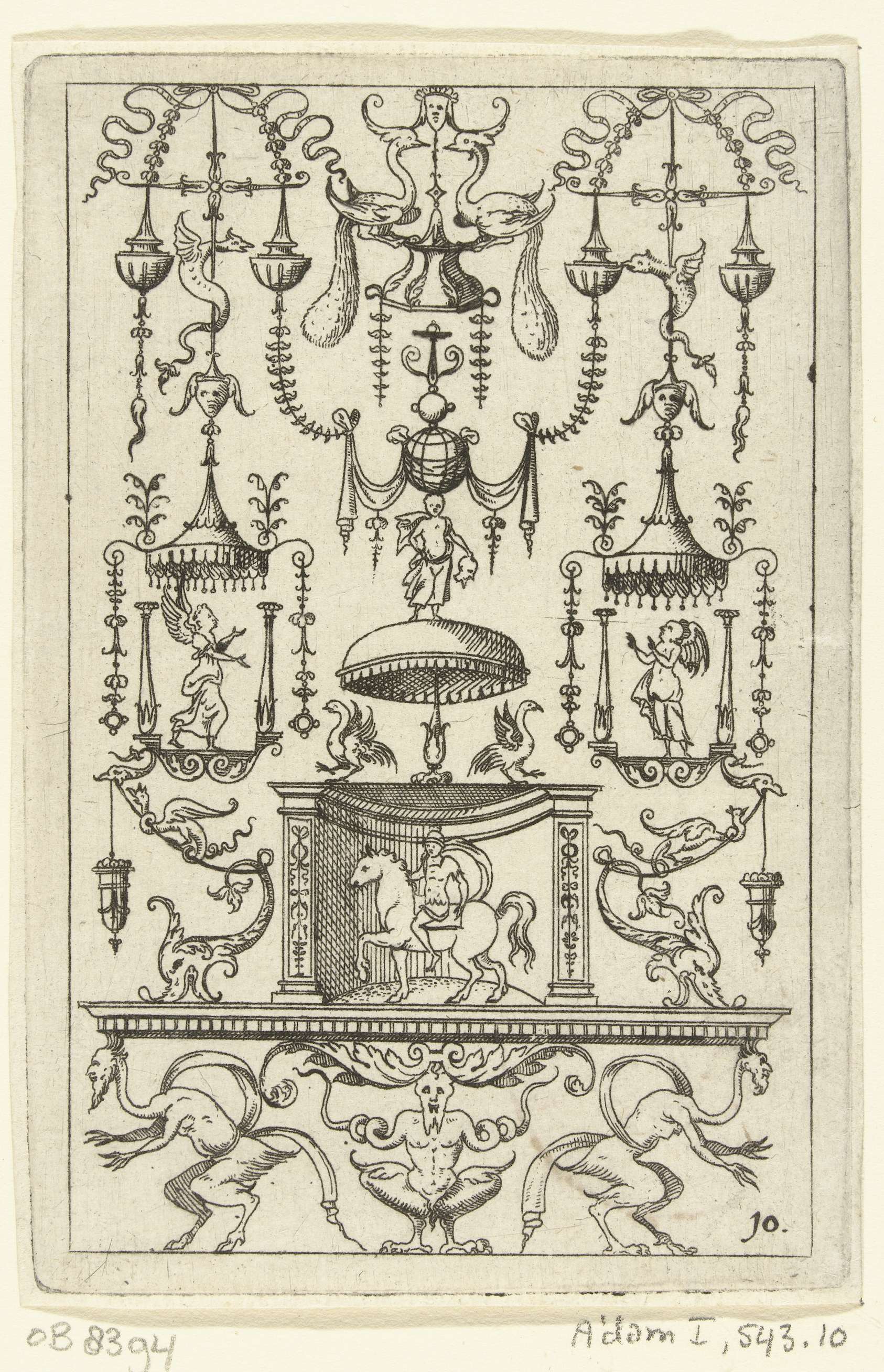 Op een tafel, gesteund door een gehurkte sater, staat een ruiter voor een nis