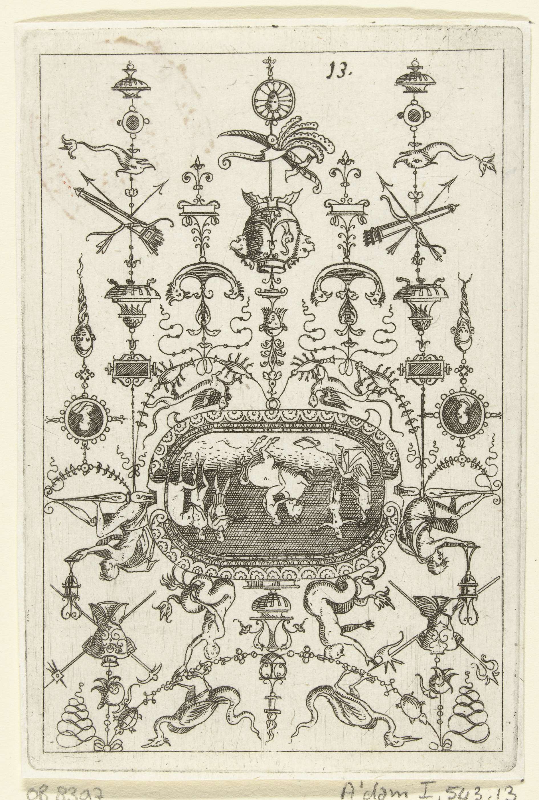 Blad uit serie met architectuurfantasieën en grotesken met fabelwezens, guirlandes, kandelabers en mascarons.