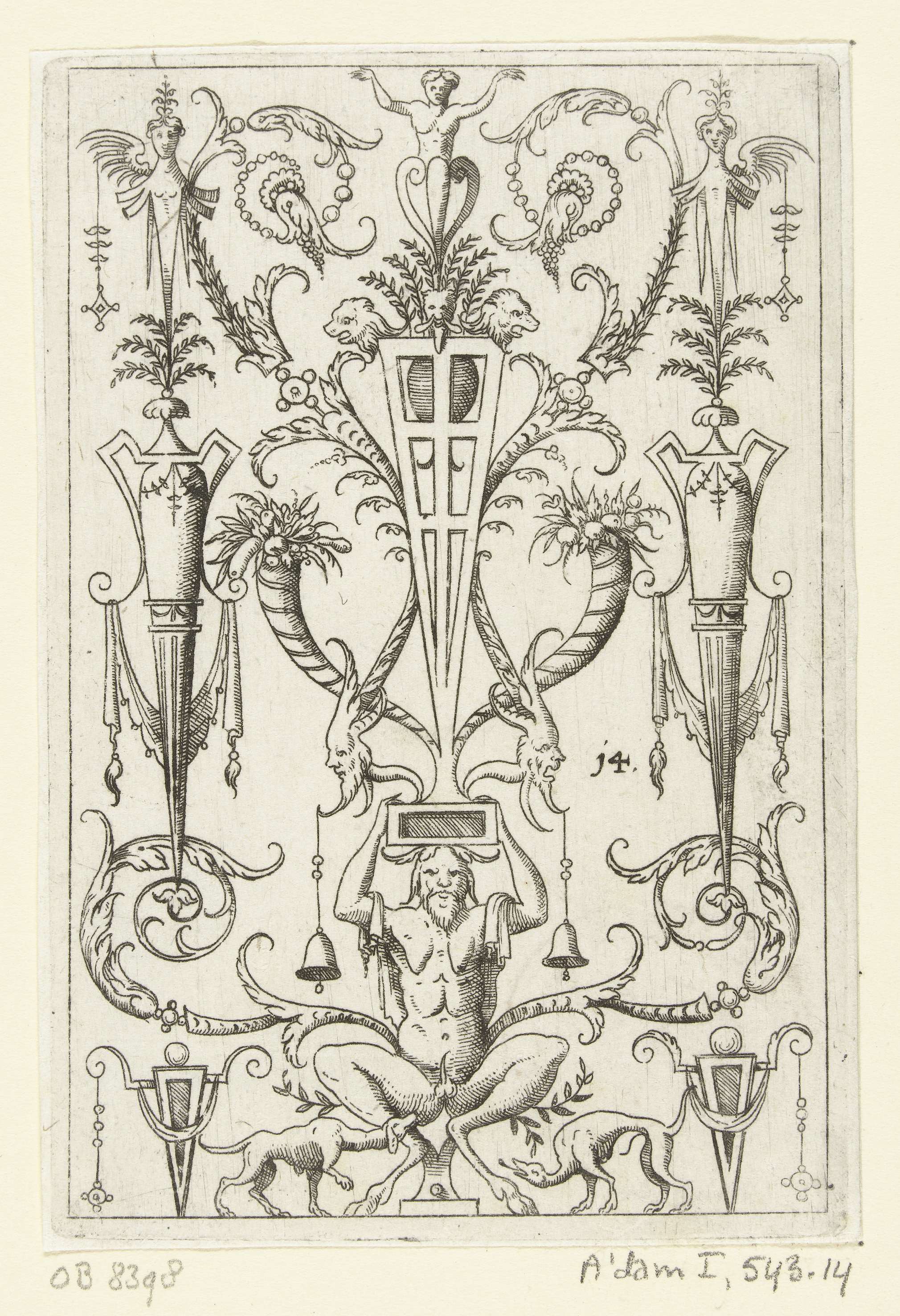 Kopie naar prent van Jacques Androuet Ducerceau, die mogelijk het voorbeeld voor deze prent in de omgeving van Cornelis Bos gevonden heeft. Blad uit serie met architectuurfantasieën en grotesken met fabelwezens, guirlandes, kandelabers en mascarons.