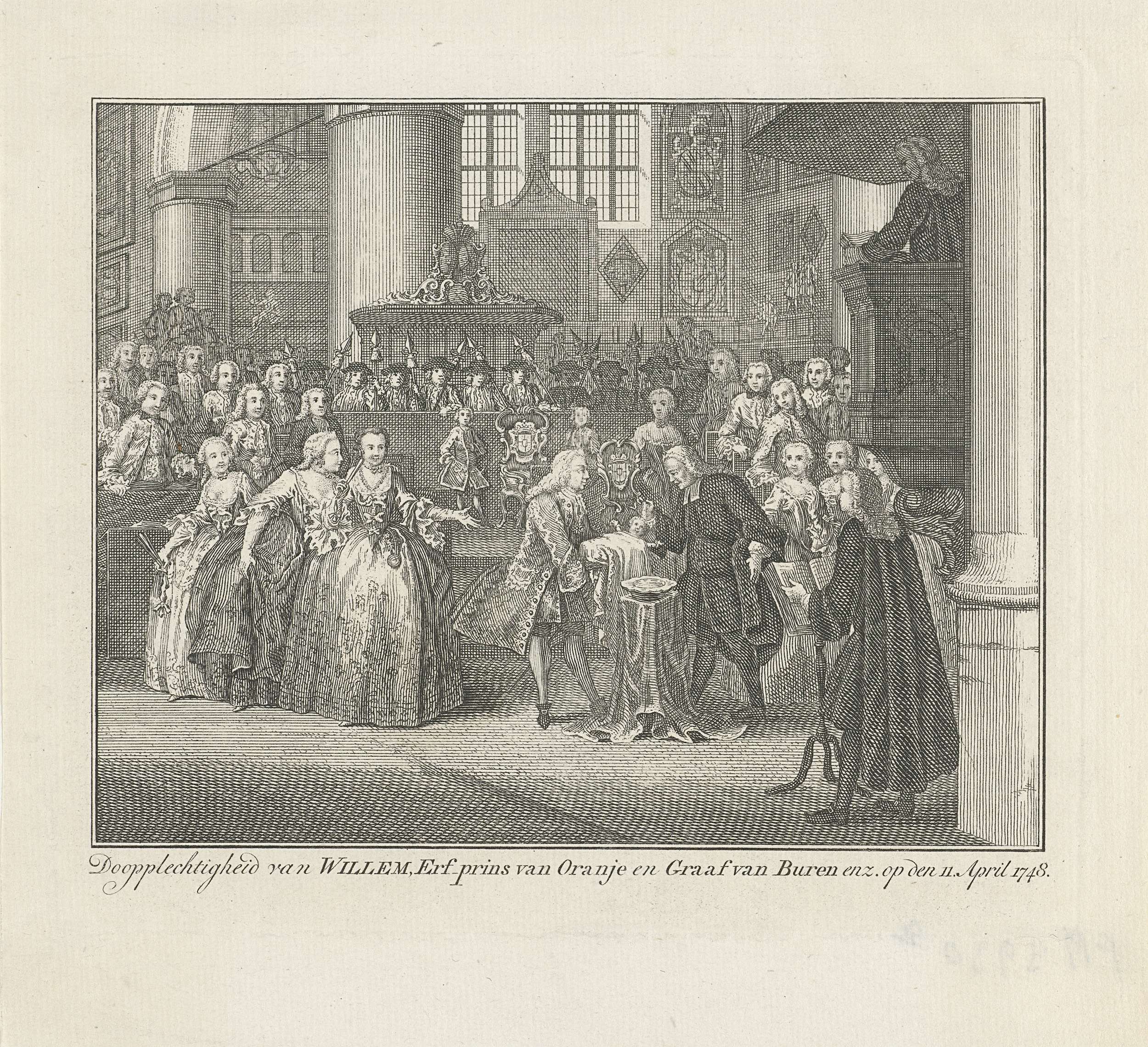 Doopceremonie van prins Willem V in de Grote Kerk te Den Haag, 11 april 1748. Willem IV houdt het kind tijdens het dopen vast, links kijkt de prinses met hofdames toe.