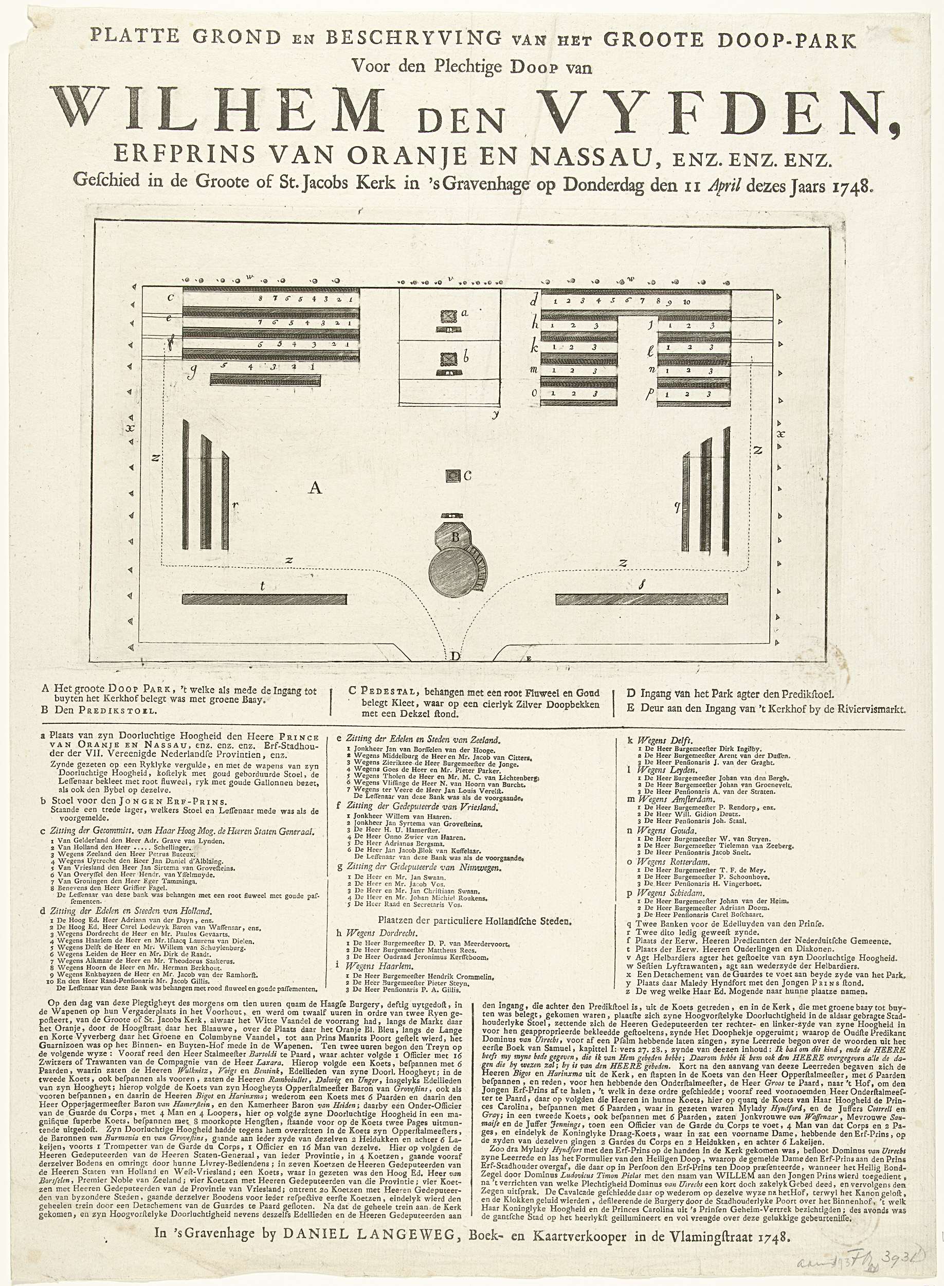 Plattegrond van de doopceremonie van prins Willem V in de Grote Kerk te Den Haag op 11 april 1748. Op het blad onder de plaat de legenda voor de zitplaatsen en een beschrijving van de gebeurtenissen.
