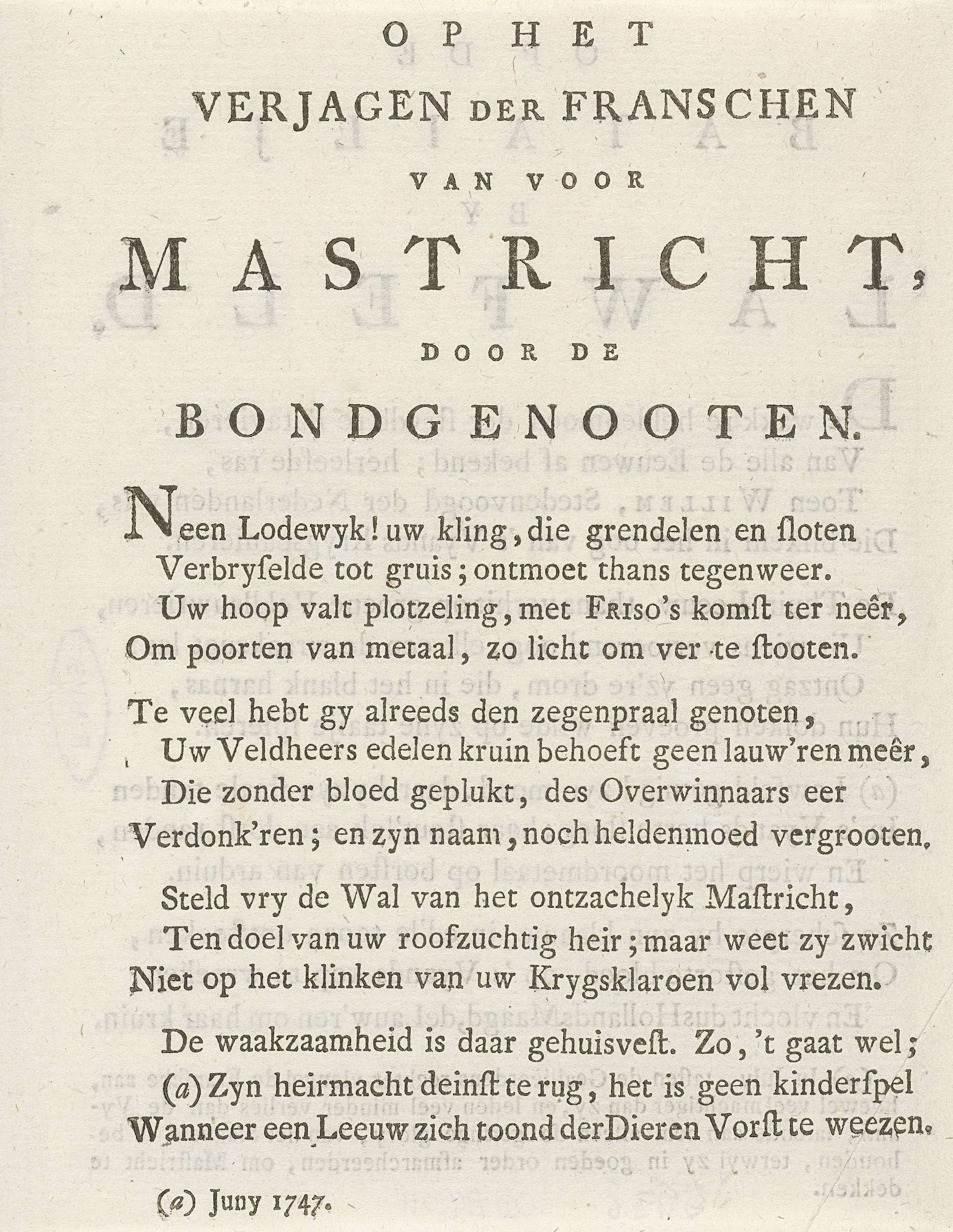 Vers op het verjagen van de Fransen voor Maastricht, 1747