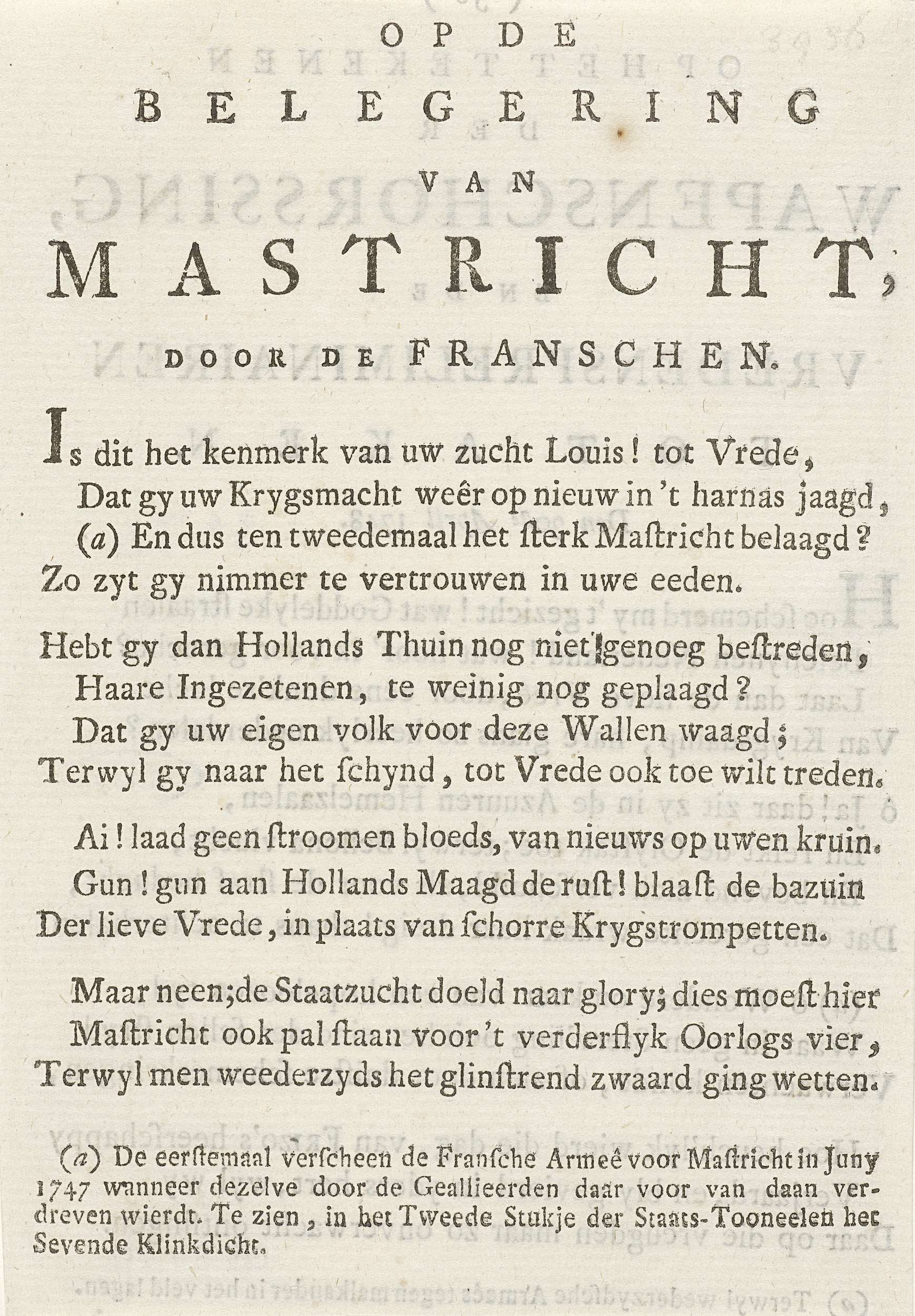 Vers op het beleg van Maastricht door de Fransen, 1748