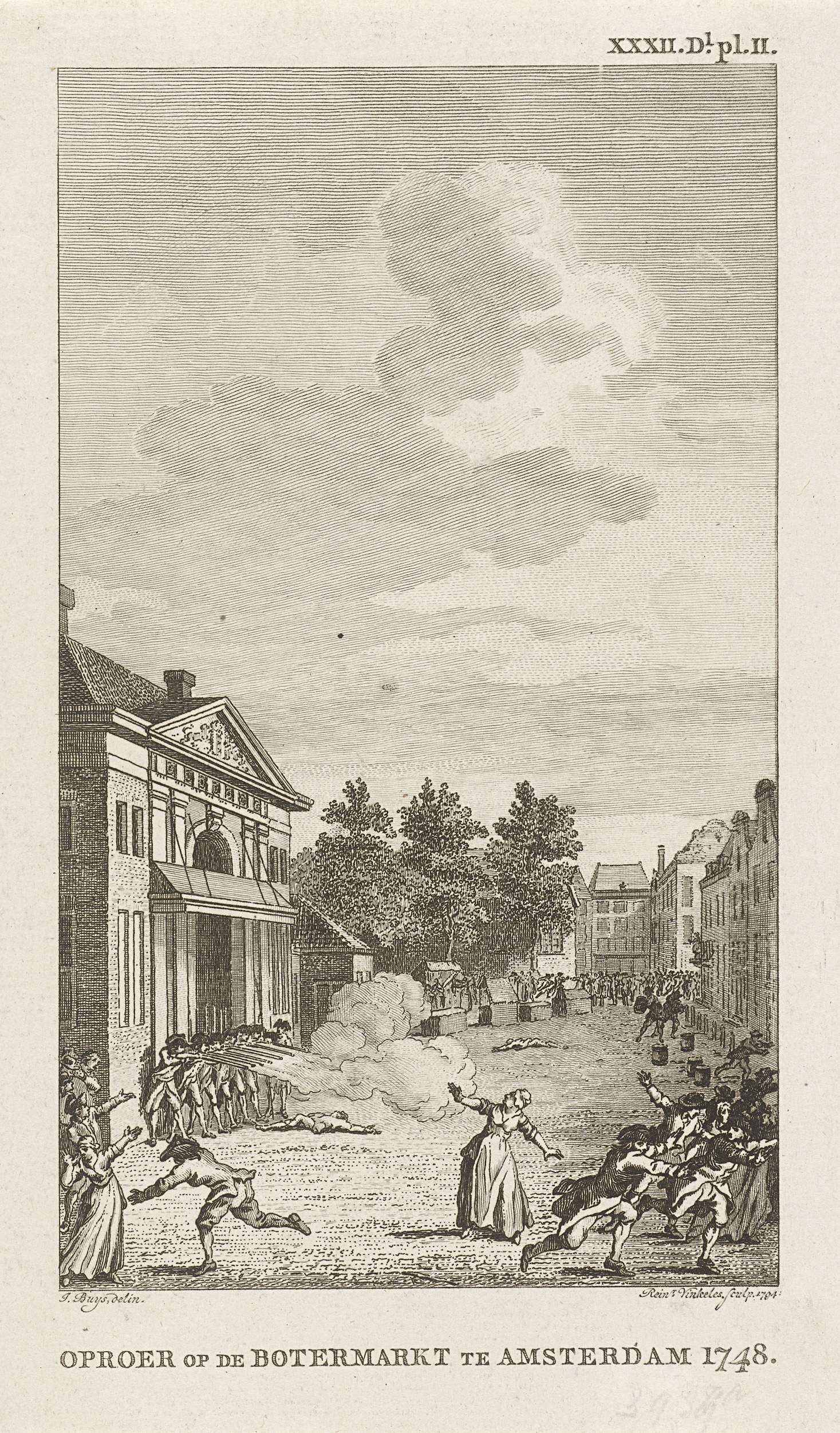 Oproer op de Botermarkt te Amsterdam 1748. Soldaten staande voor het Waaggebouw (Regulierswaag of Boterwaag) schieten op rellende burgers. Gemerkt rechtsboven: XXXII. Dl. pl. II.